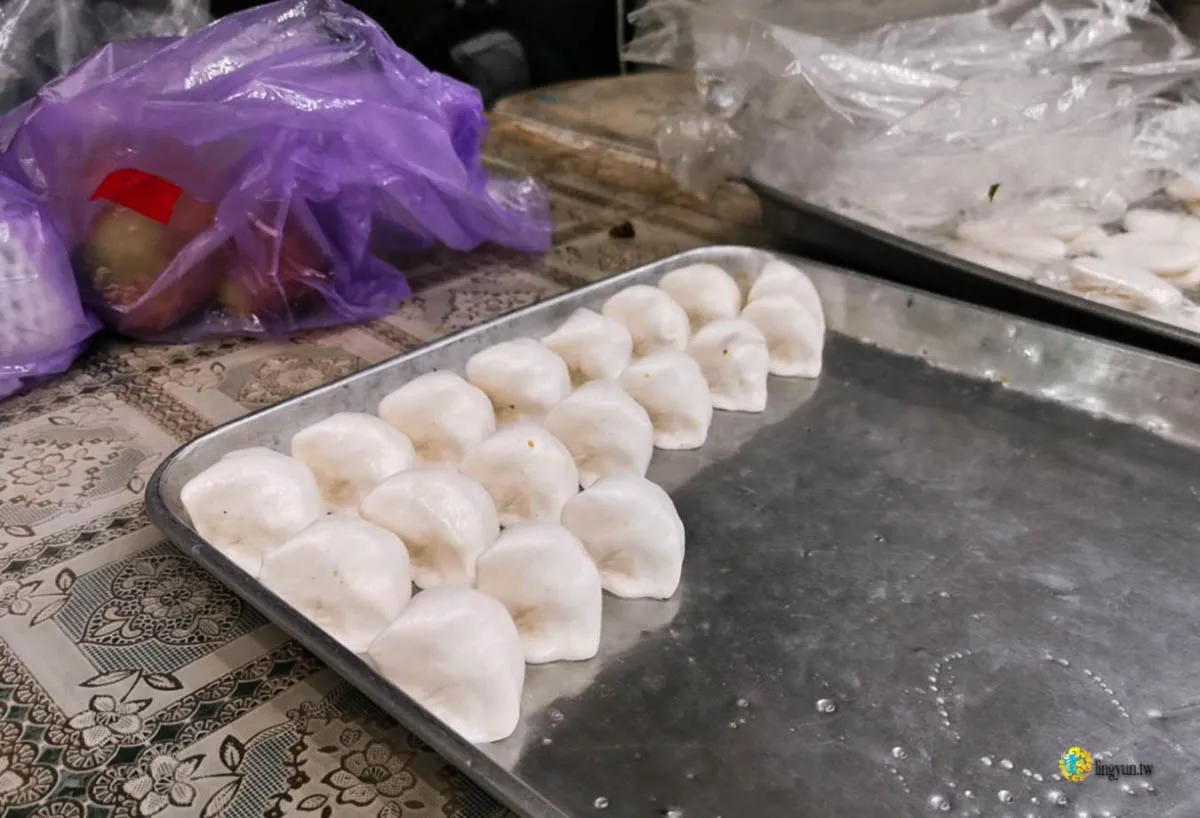 在凌雲用餐期間,內用或外帶的人潮幾乎沒中斷過,尤其一堆電話來下訂鹹湯圓,看店員包湯圓的手幾乎都沒停過。店員就在用餐區入口的左手邊勤快的包著湯圓,整大盆的內餡跟麵皮,逐一變成立體的三角鹹湯圓排排站。