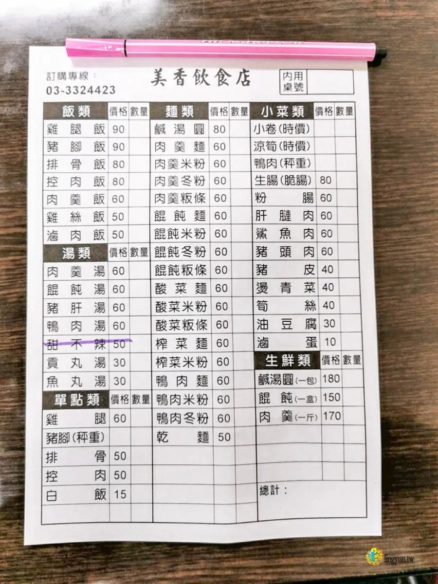 美香飲食店的菜單,簡單的一張,依據飯、湯、麵、小菜等等去分類,清楚明瞭。