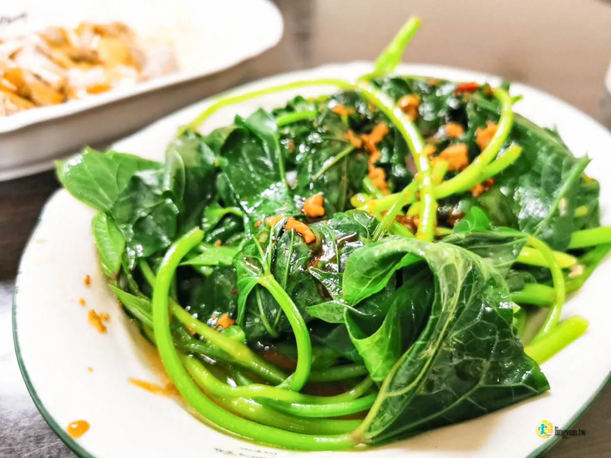 今天的燙青菜,送上來的是地瓜葉,葉梗吃起來脆口,整體口感佳。淋上的醬汁,一樣有些許微辣,還蠻好吃的,但不吃辣的女王就頗有微詞。