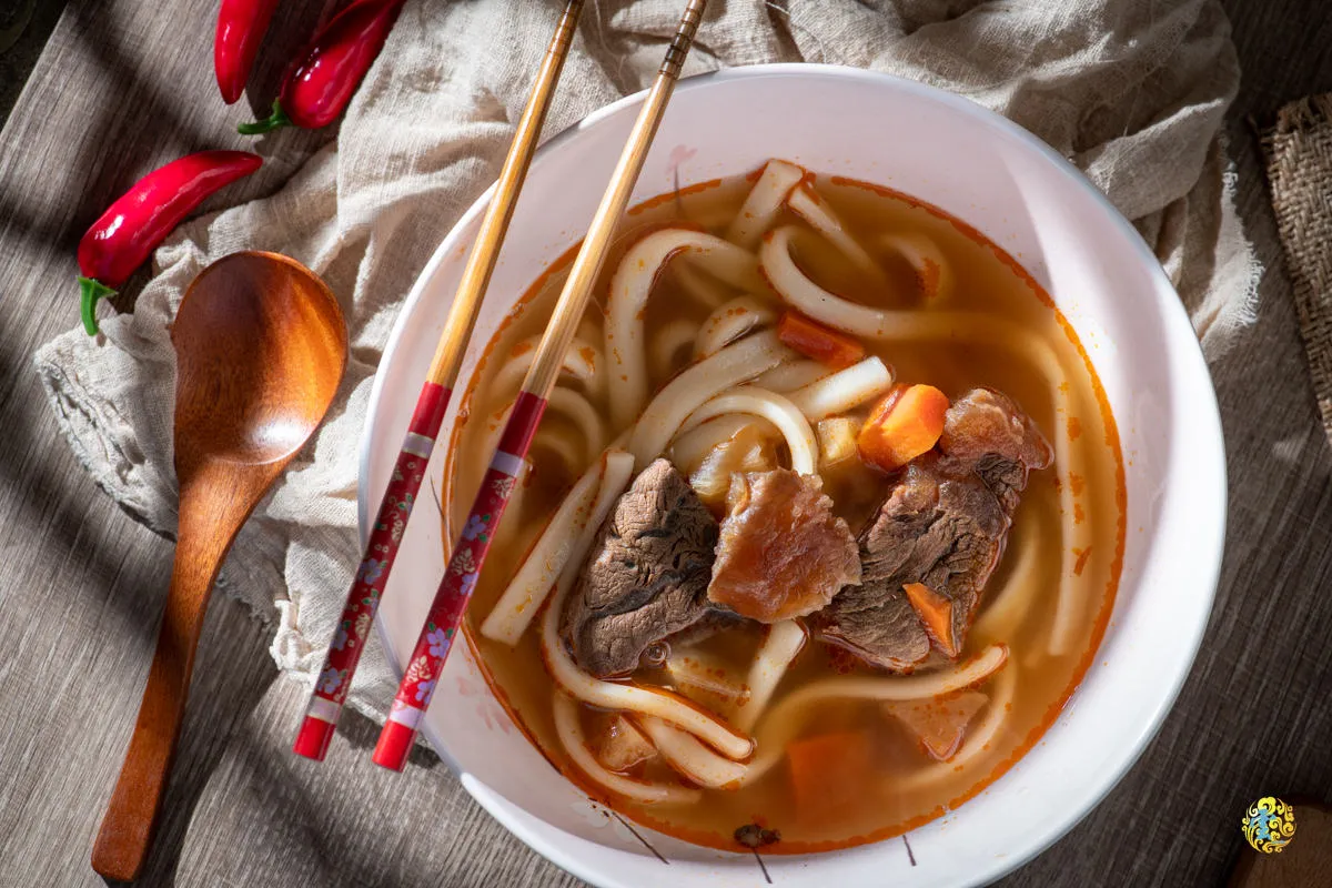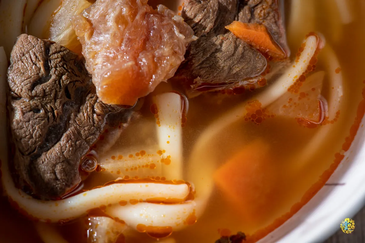紅燒牛肉麵的湯底,是以陳年豆瓣爆香拌入非基改黃豆純釀醬油,與大量蔬菜及蘋果慢火精燉八小時熬製而成。刀削麵麵體有著明顯的軟Q嚼勁,飽吸紅燒湯頭的精華,一首美味協奏曲在舌尖上大放異彩。半筋半肉的美國腱子心肉,給的大塊又厚實,牛肉略帶鮮嫩與Q黏的口感,風味香醇,滿滿膠質的牛筋,那帶有韌性的嚼勁饒富咀嚼樂趣。輕微的辣度帶有後勁,也達到了提味效果。