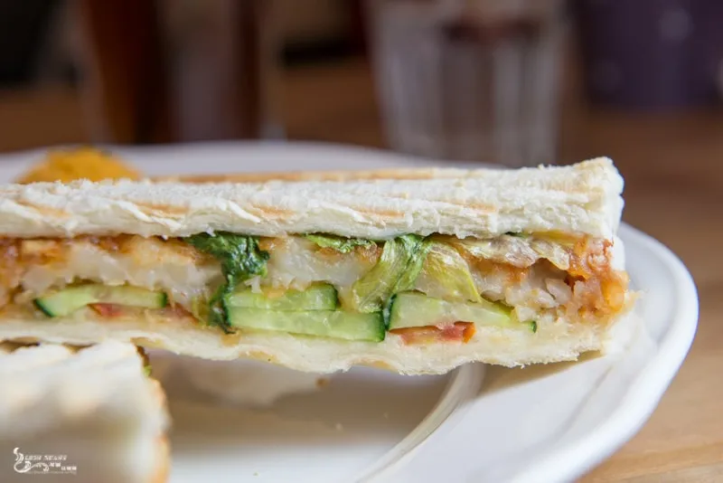 全麥土司包著小黃瓜、生菜、起士片、薯餅等等