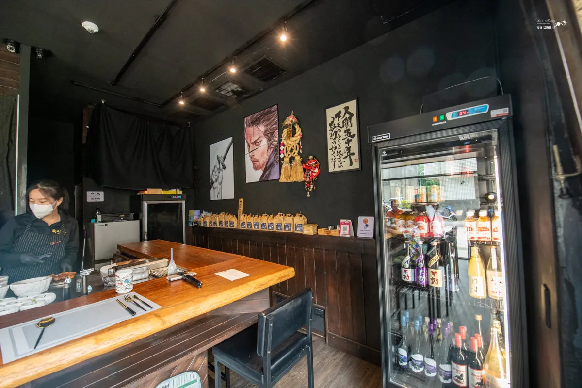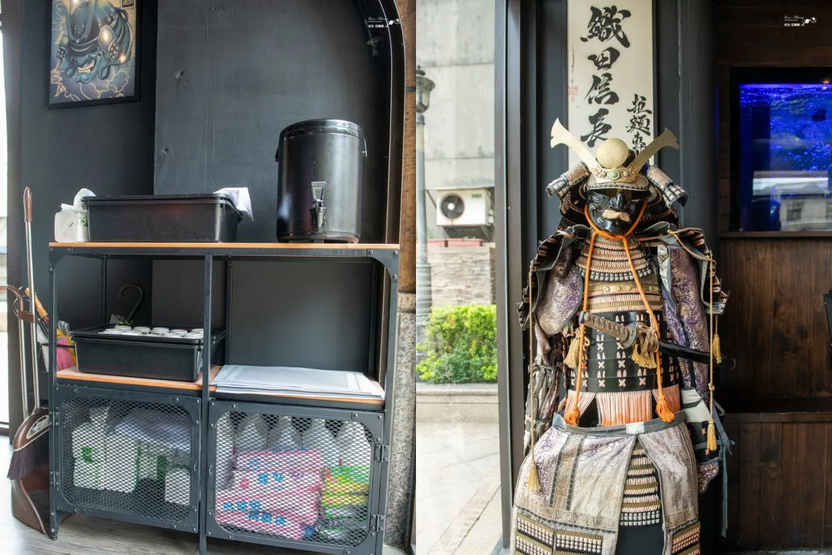 圖|尊榮的12個座位,直接欣賞主廚的料理過程。 圖|牆上日本漫畫家井上雄彥手筆下的織田信長畫像,是吸睛焦點。 圖|餐具自助區與應景的日本武士盔甲造景。