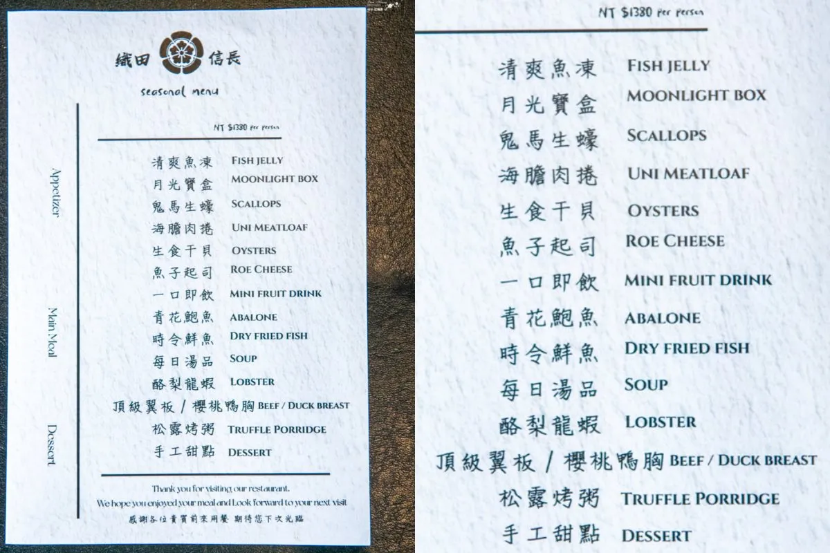織田信長無菜單手作料理,每道料理都是店家手工製作的,整套共14道料理,每位顧客收費$1380,且不收服務費喔。菜單的細節內容會依照當天進貨的海鮮不同而有變動,主體菜單約3-6個月會更新菜單,會在臉書粉絲頁公佈菜單。這一季的菜單午餐是頂級翼板與櫻桃鴨胸二擇一,織田信長店員會在預約日期的前一天來電詢問,是否有飲食上的禁忌,在用餐當天,主廚也會再詢問一次,針對需求做菜色上的微調。