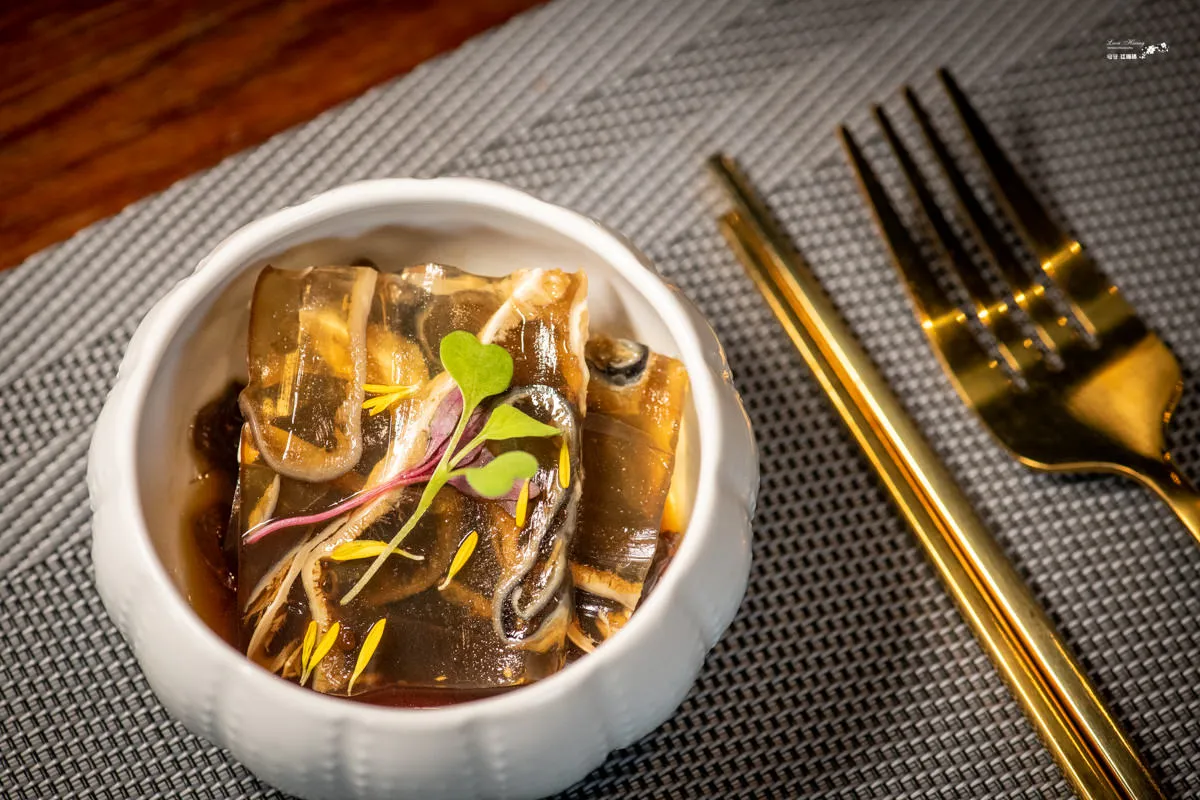 將曼波魚與鯊魚的皮熬煮,讓他的膠質成果凍狀,在一塊一塊拼接起來,裡面一格一格的是鯊魚皮,底下撲著店家自行醃漬的水雲菜。清香爽口的魚凍與吸附醬汁的水雲菜,帶來清涼脆嫩的口感,最後淡淡的辣味,將整體滋味帶上另一個高峰