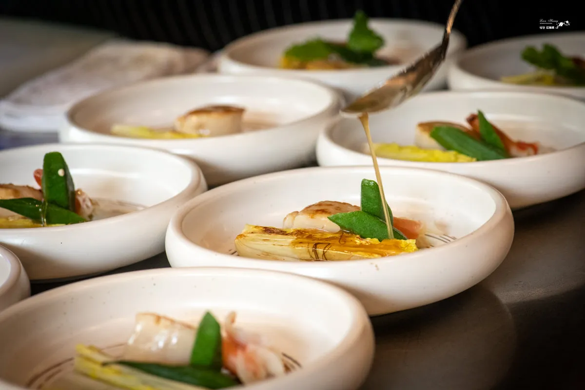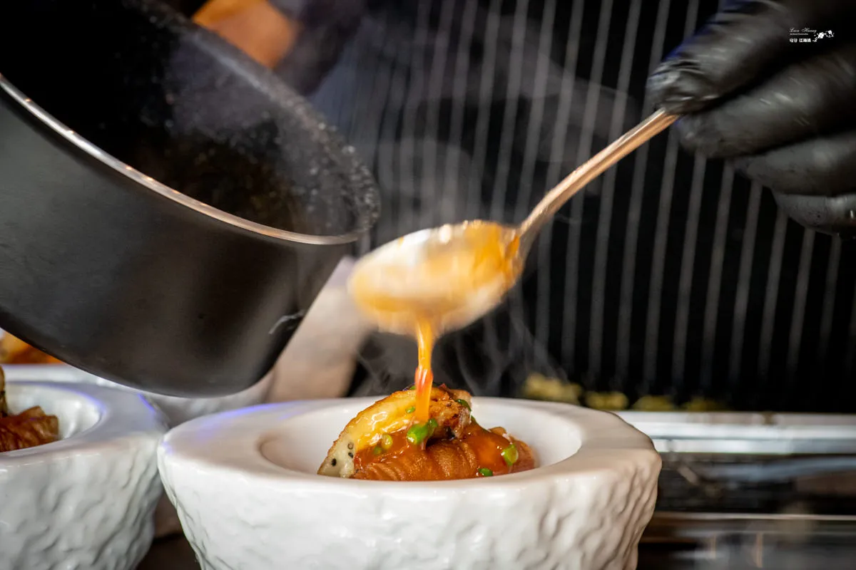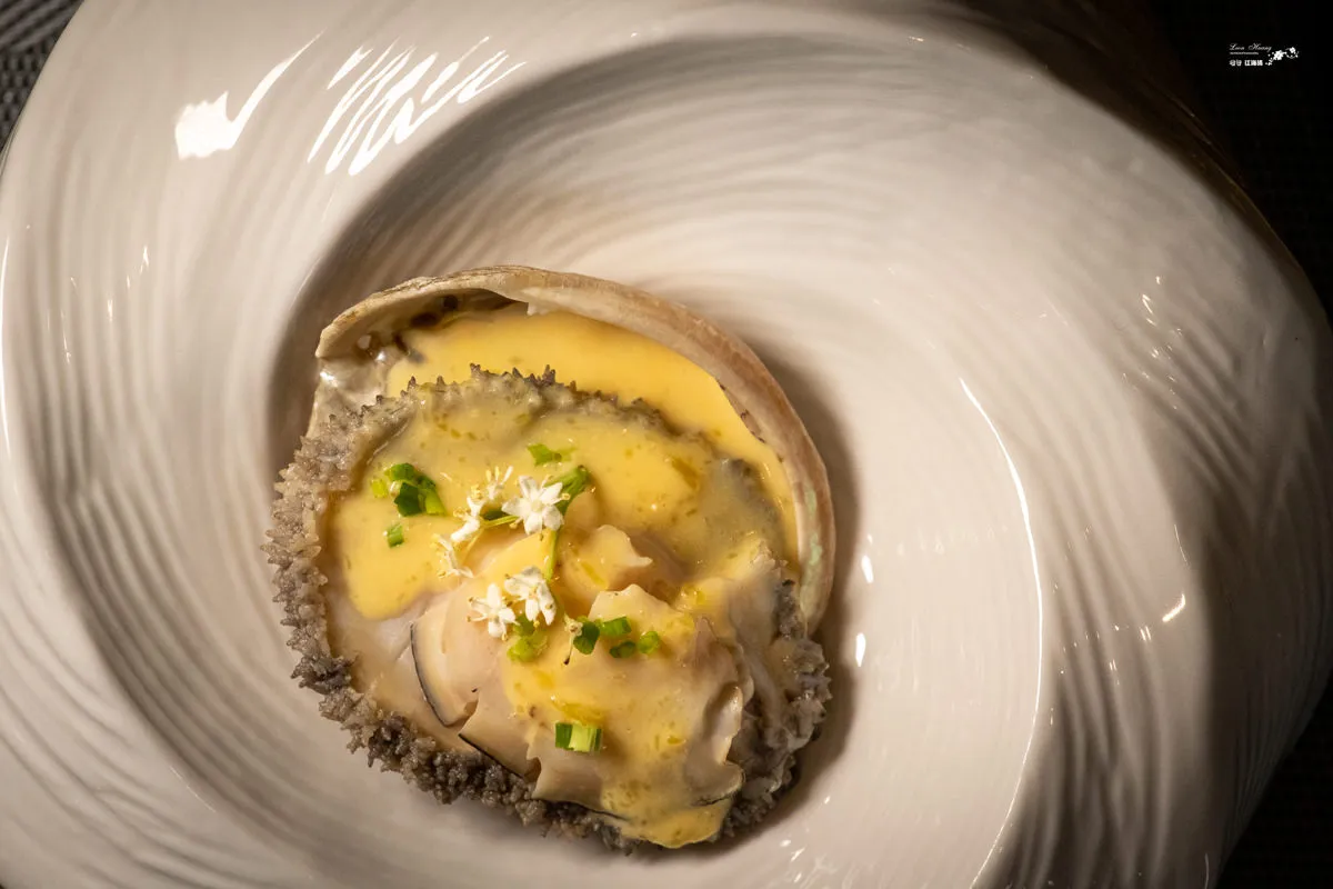 青花鮑魚淋上極具創意的香茅南瓜醬,是一道令人讚嘆不已的美食。一口咬下鮑魚,首先會感受到其肉質的鮮甜與彈牙的口感,煎至8分熟的烹調方式,讓鮑魚的口感更加柔嫩,細膩的肉質在口中溶化,讓人陶醉。口腔盈滿香茅和南瓜的淡淡香氣,帶著一絲清新的檸檬味道,與鮑魚的鮮美完美融合,讓人愛不釋口。食用花點綴的裝飾增加了視覺上的享受,讓整道菜更加精緻和美味。青花鮑魚帶來的不僅是口感的享受,還有對食材的敬重和對烹飪的精湛技藝的讚嘆。