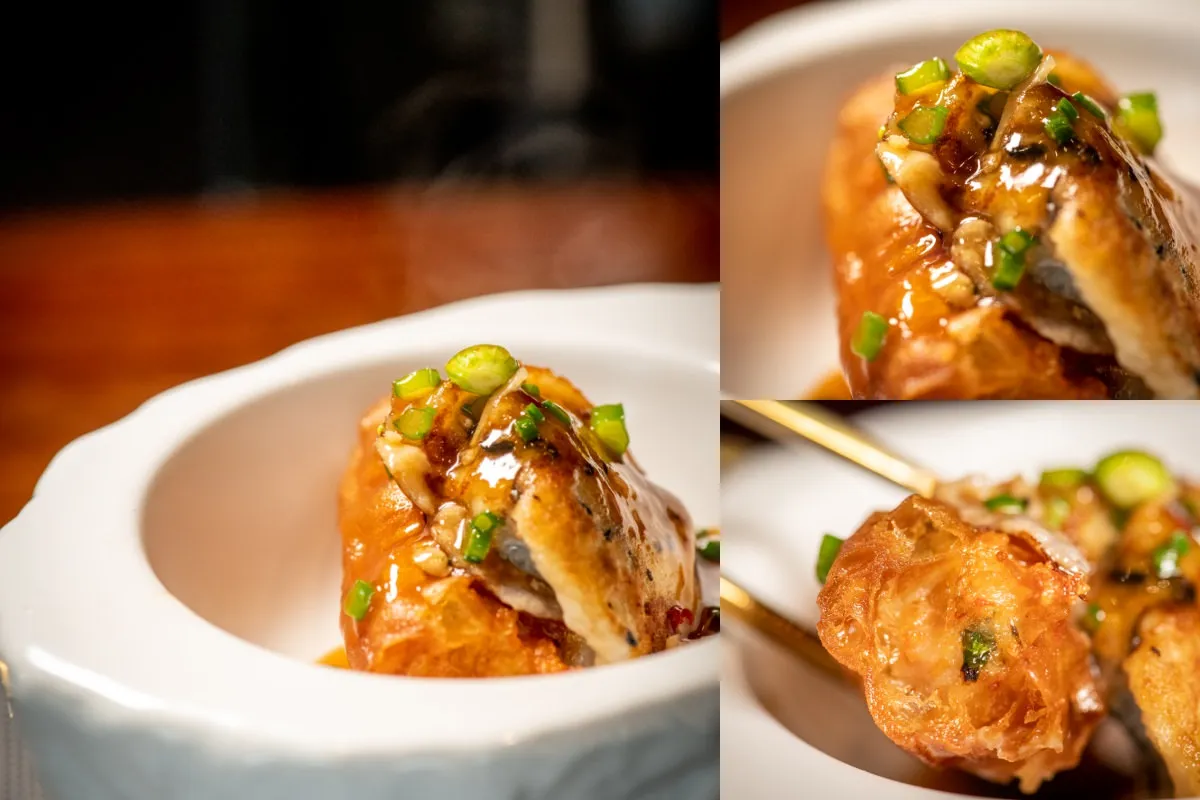 鬼馬就是台灣俗稱的油條,剛油炸的油條相當酥脆,裡面還包裹著蝦肉,有蝦捲的那種FU,嚼勁十足。內裡柔嫩彈牙的廣島牡蠣,吃得到鮮鮮海味,上頭淋的是由魚香醬去改良過的醬汁,嚐起來酸酸甜甜的。一上桌就香味撲鼻,在鬼馬營造的酥脆多汁風味中,讓生蠔的鮮味更加立體又不失豐厚海味。