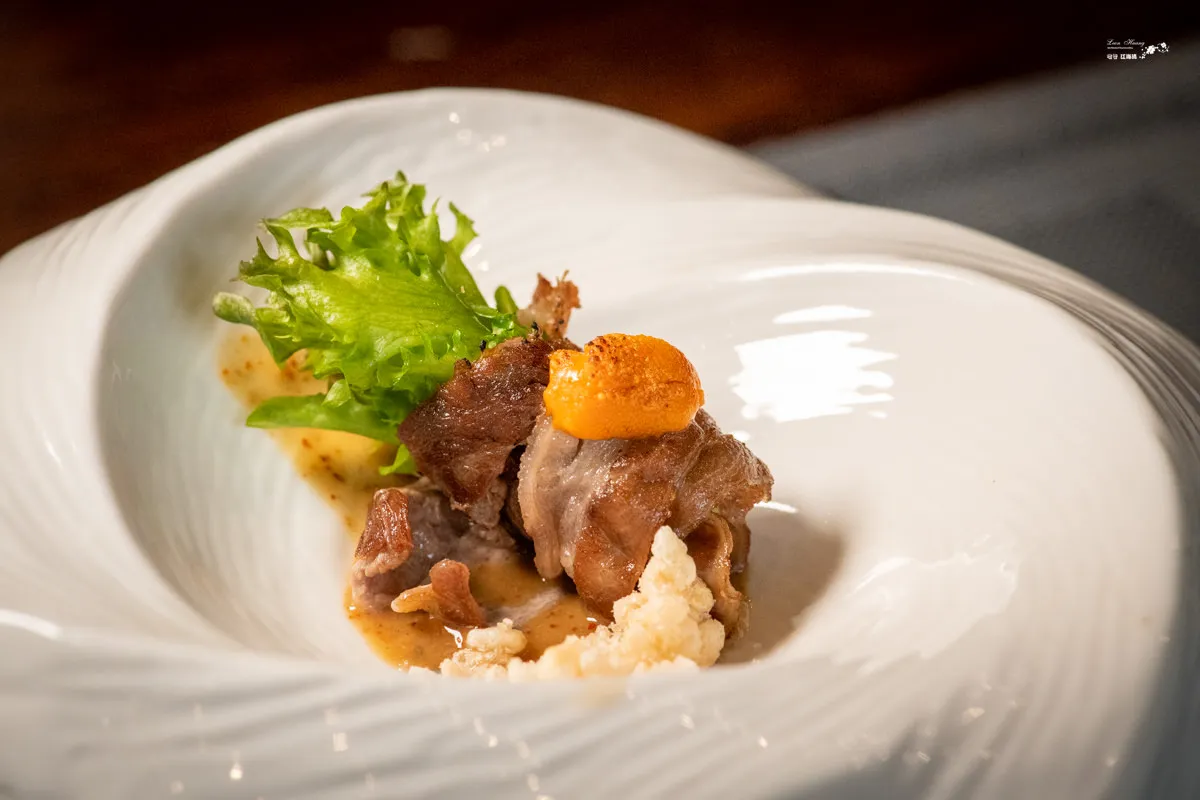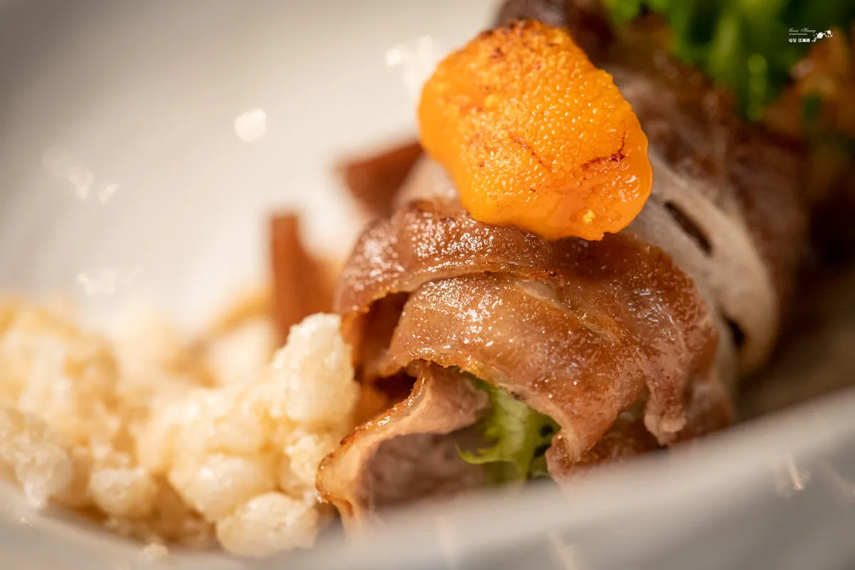 海膽的鮮甜味道與牛肉的肉汁完美融合,濃郁的滋味熨貼了味蕾,炙燒過的肉卷夾帶蔬菜的可口清爽,讓整道菜鮮味和油膩感得到了平衡。底下是店家特調的花生胡麻醬,帶來微妙的辣度,令整道菜更具層次感和趣味性。肉卷使用的是牛肉,如果不吃牛的朋友,主廚會更換成豬肉卷。