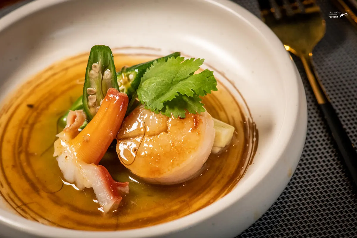 生食級的干貝會煎到約3-5分熟,干貝的外層已經煎至微焦帶黃色,口感酥脆,內部則保持著柔嫩的質地,有著濃郁的干貝香氣。脆口清爽的秋葵、娃娃菜、南瓜棒與干貝的鮮味形成鮮明的對比。淋上特調的海鮮醬,有沒有很眼熟的感覺。是的,就是你想說的魚翅羹,滿滿的酸甜海味,讓味覺整個鮮活起來。