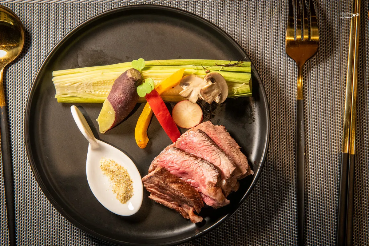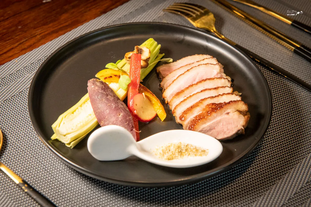 主菜共有兩種選擇,頂級翼板與櫻桃鴨胸。櫻桃鴨胸的肉質鮮嫩多汁,口感細膩而豐富。鴨肉的風味清新而帶有淡淡的甜味,在味蕾寫下驚艷的即短篇。玉米筍的脆嫩爽口、香菇柔軟的質地、地瓜濕潤而帶有黏性的口感,為整道菜提供了一種豐富而輕盈的滋味,也適時的調解油膩。沾點蒜鹽更能提升風味喔。