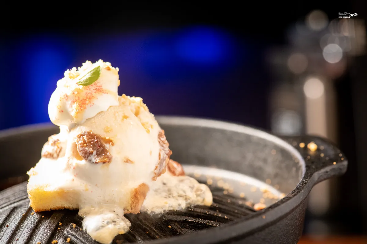 在吐司放顆香草冰淇淋,再撒上些許葡萄乾,擺至烤盤上,最後在冰淇淋的周圍淋上紅酒,增添迷人酒香。焦香吐司酥酥脆脆的口感凸顯出香草冰淇淋的細膩柔滑,乳香的甜美滋味與齒頰留香的嚼勁,彷若舌尖上的美麗新世界,是道令味蕾驚艷的甜品。