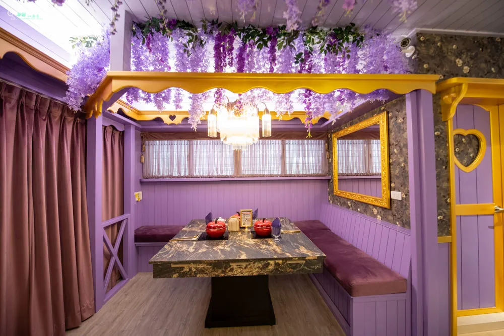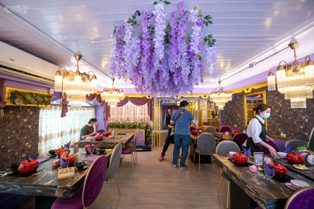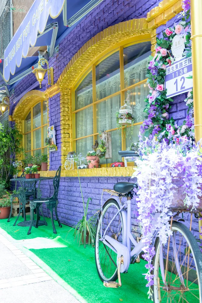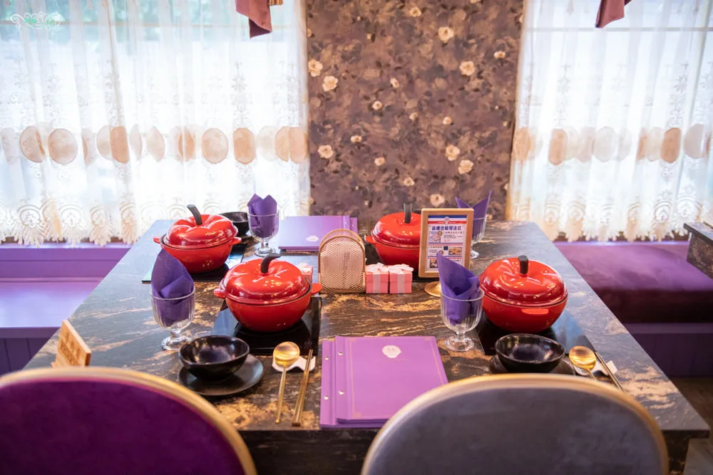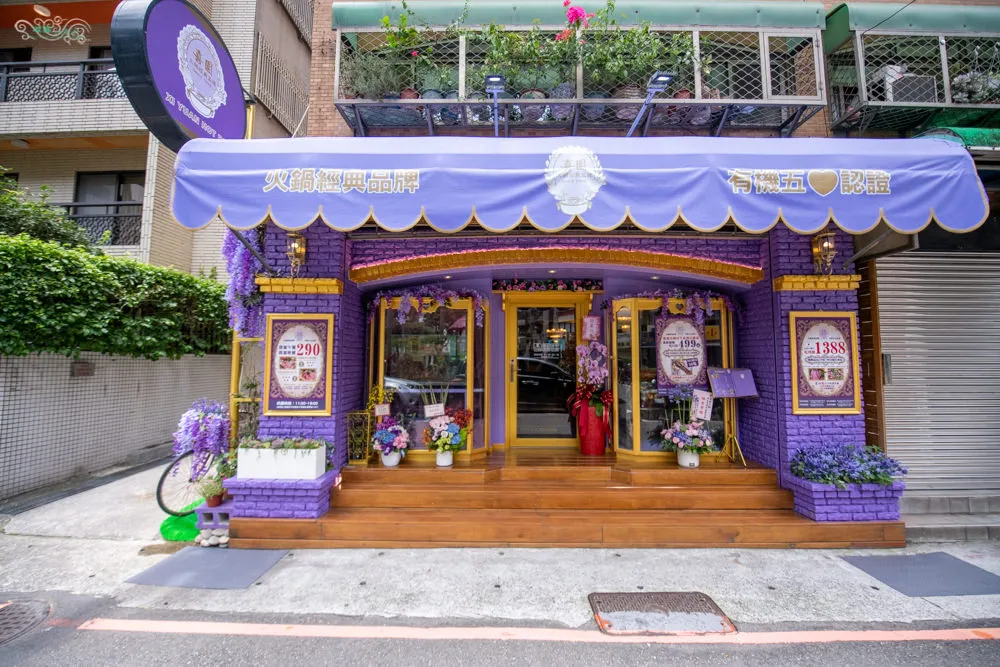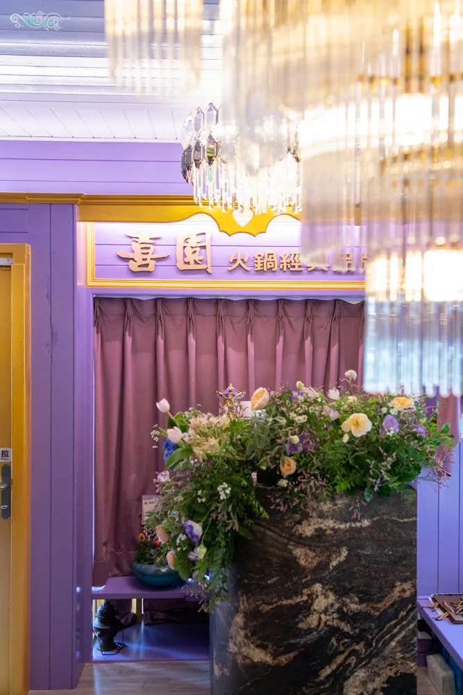 喜園涮涮鍋 民生浪漫店 開在民生東路三段的靜逸巷弄內,前方是別名貓花公園的民有二號公園,距離最近的中山國中捷運站,約莫5分鐘路程。超醒目的紫色瑰麗店面外觀,遠遠的就注意到他了,經過的人車總是不自覺得會多看向他一眼。有點藍又有點粉的浪漫紫色,以色彩學來說,他帶有藍色的穩定,又兼具紅色的活力,同時也給人一種奢華與高貴的視覺感,以及浪漫優雅的聯想。