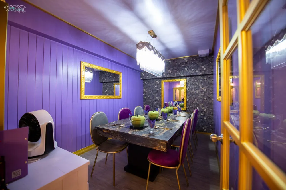喜園長方形的用餐空間,有一樓與地下室兩大區塊,地下室還有兩間包廂,非常適合商務會議、私人聚會以及注重隱私的朋友。大量活用浪漫與貴氣兼具的紫色做空間點綴,復古華麗的燈具、鏡框、櫃子與空間線條,大膽的使用了與紫色為對比色的金色,給予了鮮豔活躍的視覺感受,還隱隱流露出復古氣息,逐漸深入的色彩層次讓紫色浪漫深刻的烙印在來訪賓客的腦海中。