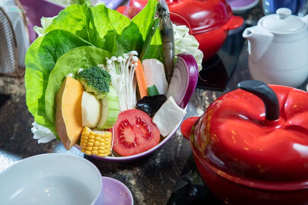 菜籃內的蔬菜種類相當多樣,全都是經過慈心農場有機認證的新鮮蔬菜,放在鍋中隨著湯頭滾熱咕嚕作響,馥郁的香氣隨著沸騰的高湯蔓延。