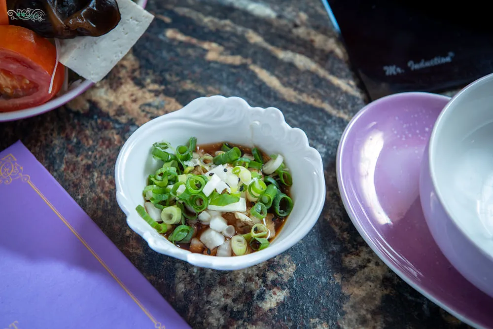 不同於一般店家提供的檸檬水,喜園給你藍紫色的有機花果水,而且每天內容物不一定相同,今天的有機花果水裡面有:芳香萬壽菊、蝶豆花、小黃瓜、紫蘇葉、薑黃、檸檬與柳橙等,不只好喝更可以感受到喜園的用心,聞起來有著淡淡的清香,吃重口味的火鍋時,還可以順順你的胃。