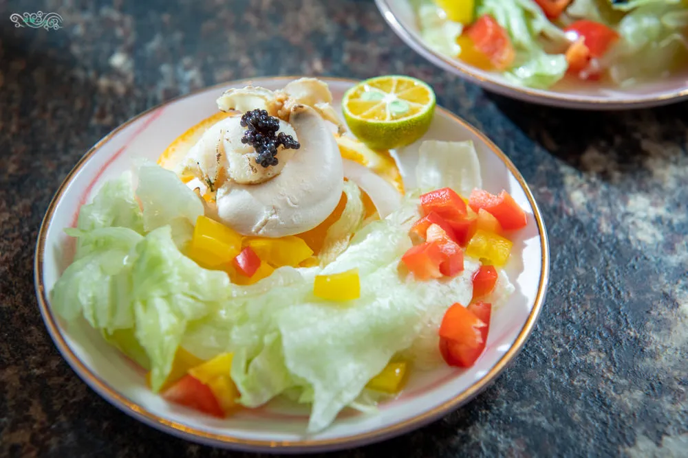 》經典前菜:炙燒北海道扇貝佐法國魚子醬有機沙拉
