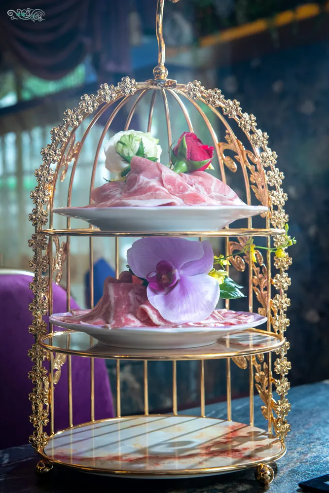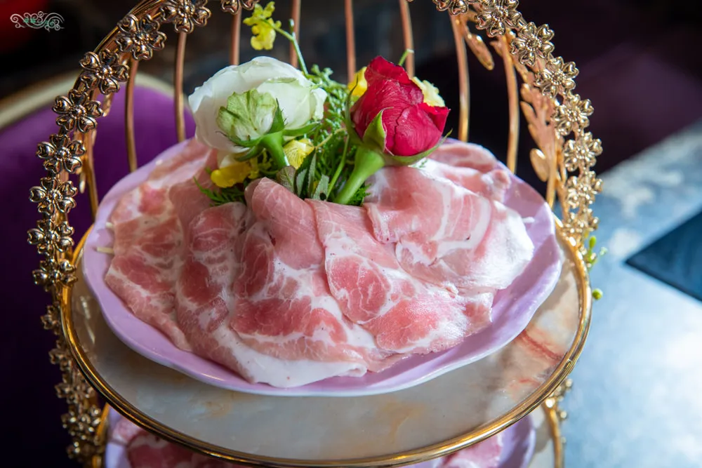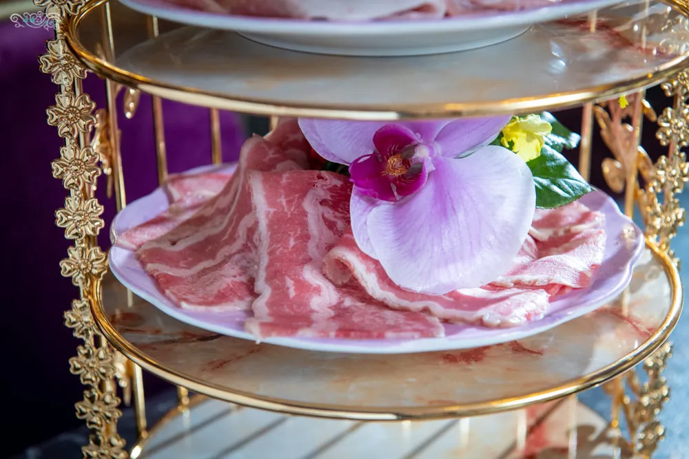 套餐附的丹麥健康無染梅花豬與美國培根嫩牛肉,搭配華麗的三層架浪漫上桌。油脂分布適中的梅花豬,吃起來多汁但不過於油膩,沾上店家特製醬汁,溫潤鮮美好滋味。取自牛胸腹的美國培根嫩牛肉,水滾後汆燙個幾下,肥腴滑嫩的味蕾旅行,每一口都讓人超滿足。
