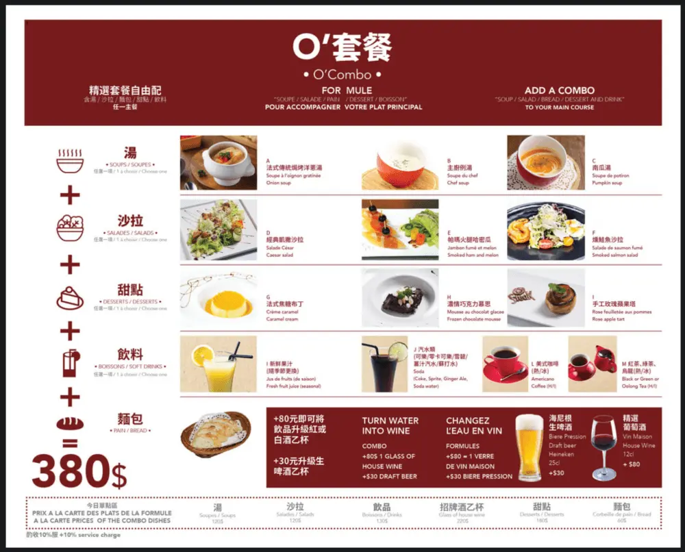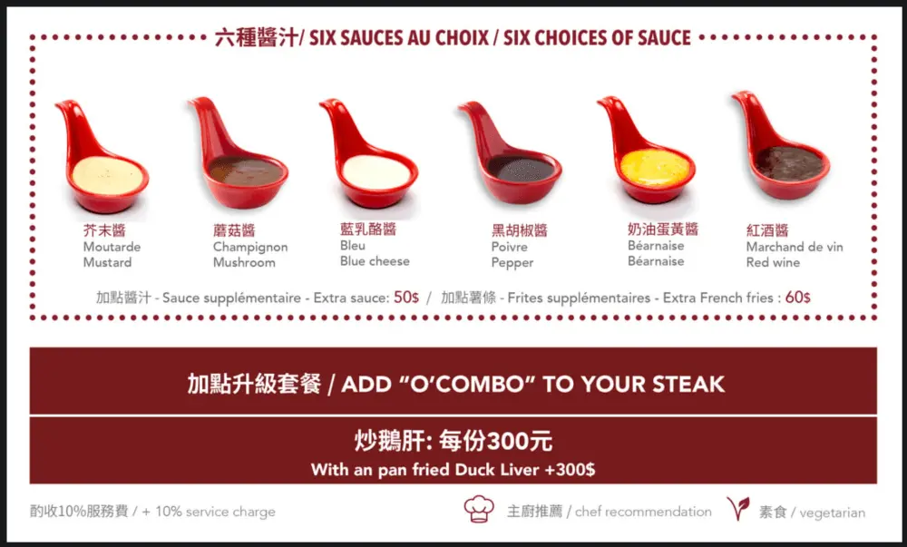 波爾多紅與奶油白組合成的菜單,每一種餐點都附有精美的圖文說明,菜名、優惠信息等資訊都分類清楚,讓人很容易就能找到自己想要的餐點。詳細的全新菜單與特色套餐,請前往O'Steak Taipei官網查詢。