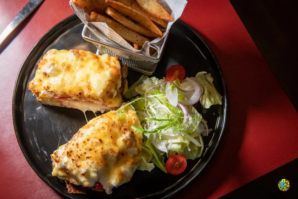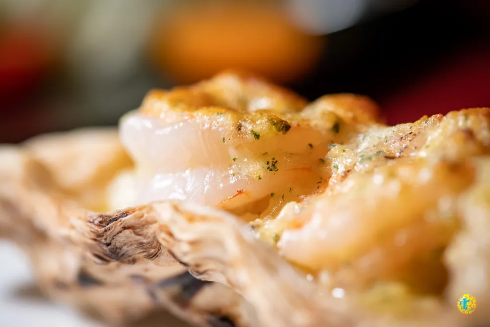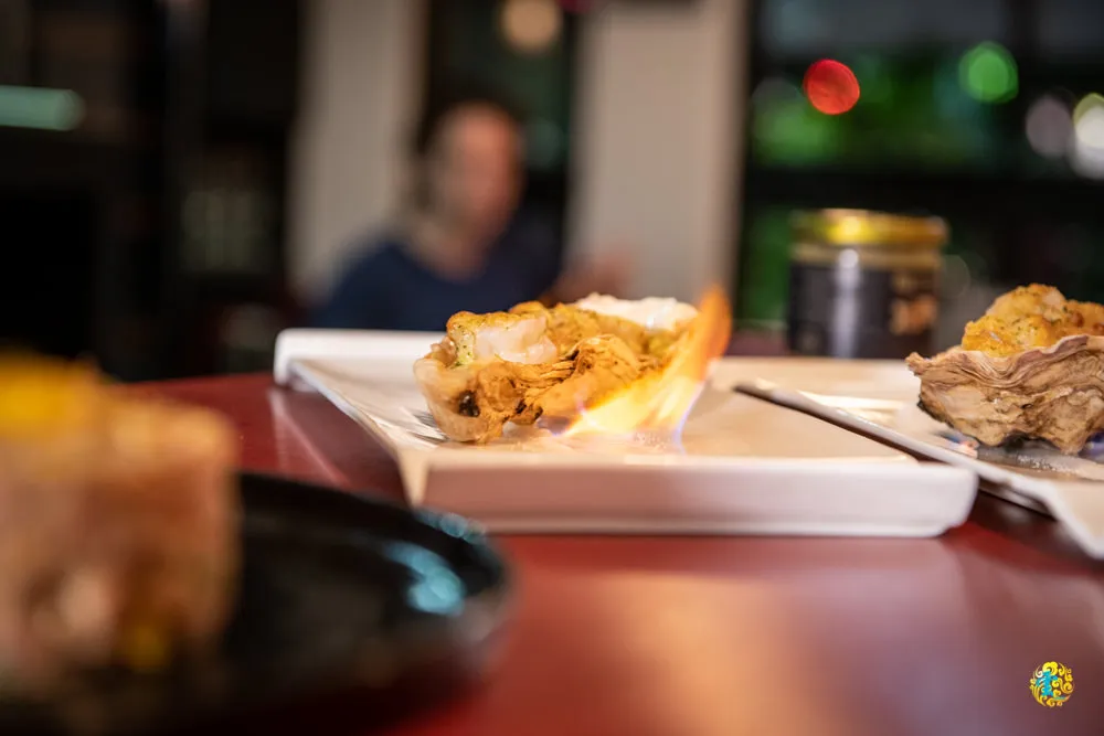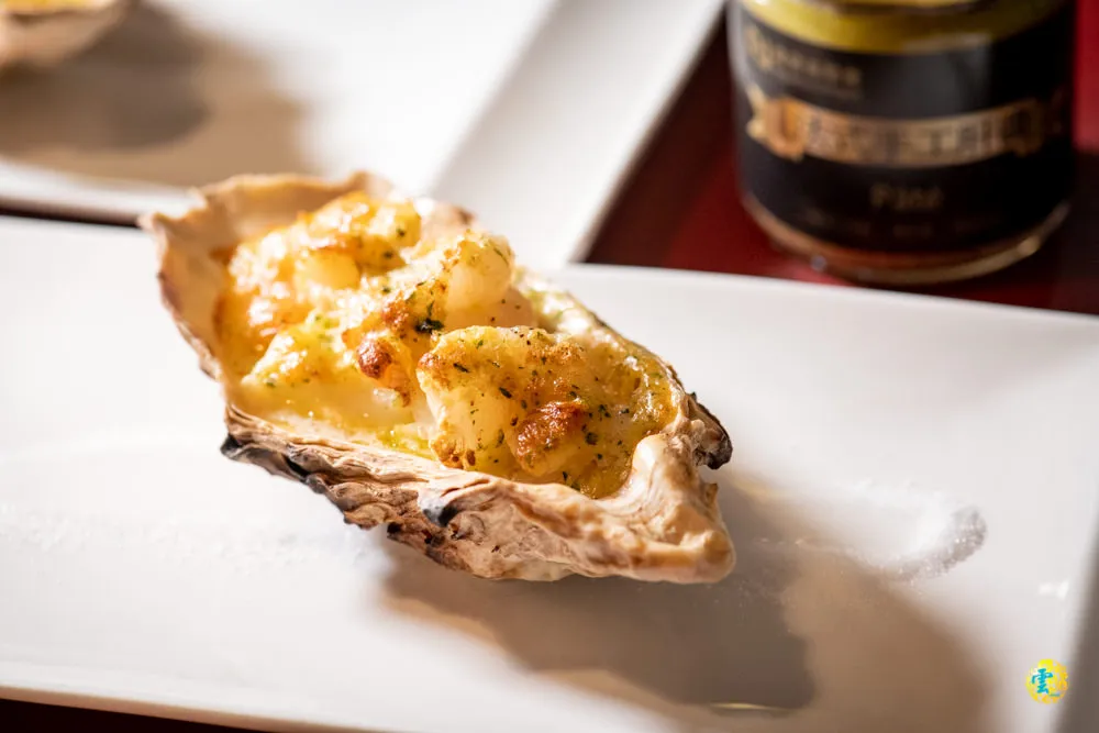 上桌後就看老闆尼凯點起火來,視覺效果十足的上菜方式。偌大的生蠔殼內,除了蝦子,還有花枝、干貝跟魚肉等各式海鮮,拌上法式白醬與起司之後焗烤,淡淡的海味與香氣怡人,鮮蝦本身彈牙柔美,脆甜的干貝與帶嚼勁的花枝,給予衝突又立體的口感,使用服務人員給予的小湯匙,連著海鮮的湯汁一起食用,諸多海鮮加上精華湯汁,鮮美在嘴裡散開迴盪,真是令人無可挑惕的美味啊。