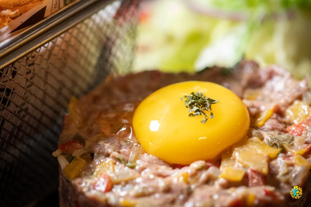 這盤完全都是生的菲力牛肉,因為菲力不帶筋不帶油花,才適合做成生牛肉塔塔,如果帶油花的生食,會有噁心感。菲力夠嫩又夠新鮮,加入一些蔬菜、青椒、紅椒、洋蔥與法式香料去作調味,服務人員建議將生雞蛋攪拌過後一起品嚐。因為全是生的牛肉,一開始還擔心吃不慣,嚐了一口後,先前的疑慮完全拋在腦後,肉質比預期中的還要軟爛,真的超嫩,沒甚麼血水,一點點的辣度豐厚了味道,肉裡的蔬菜帶來絲絲脆度,給人豐盈滿足之感。