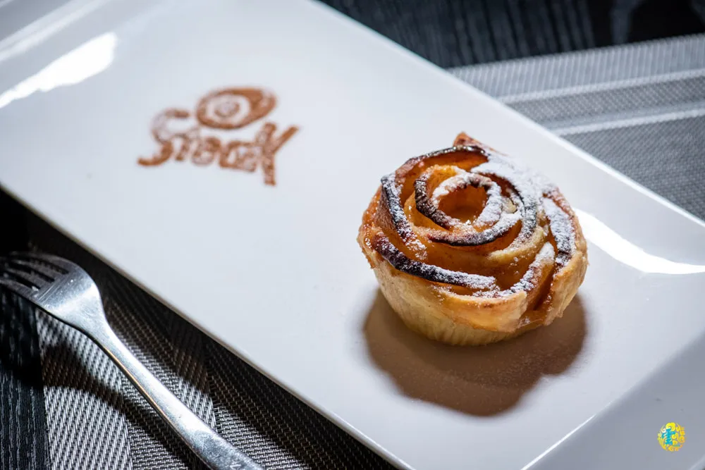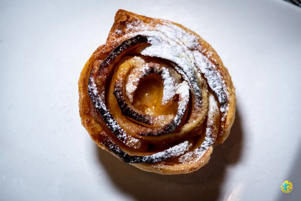 招牌的字是撒上肉桂粉製作的,一上桌,肉桂味濃郁撲鼻,十分搶戲。略帶溫熱感的甜品,外皮焦脆內裡軟,由外而內、由上而下,脆口的口感會慢慢轉變成軟濡的口感,層次立體分明又豐富。帶皮的蘋果片,增加了不少口感,撒上的糖霜讓甜度更精緻了些,是一款非常值得推薦的午茶或飯後甜點。