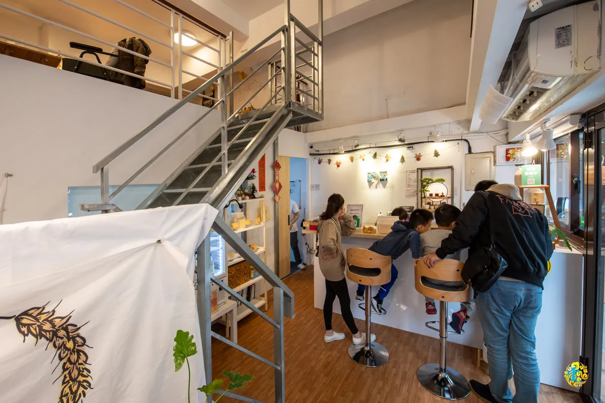 小皮烘焙製研所的空間設計極具品味,樓中樓的挑高設計帶來開闊感。當你踏進店內,首先映入眼簾的是潔白的櫃台和廚房,前方吧檯上提供兩個舒適的座位,適合享受寧靜時光,一旁還有詩籤解鎖的特別體驗空間。櫃檯旁邊巧妙擺放著各式各樣的麵包與餅乾,精緻的陳列展現出每日的烘焙精品。
