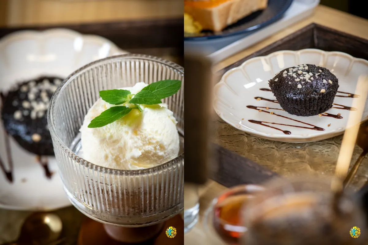 底下用可可醬點綴,中間的是苦甜平衡的巧克力布朗尼,上方灑滿核桃碎塊,再送上一球迷人的鮮奶冰淇淋。核桃布朗尼帶來的香氣濃郁而誘人,酥脆的外層包覆著濕潤的內餡,帶有淡淡的焦糖香,脆皮軟心搭著上方核桃碎塊,綿密的口感中有著微脆的咬勁,這樣的布朗尼搭配上鮮奶冰淇淋,口感更是層次豐富。冰淇淋的滑順搭配核桃布朗尼的香脆,形成絕妙的口感對比,如此華麗的誘惑,女孩們一定很難抵抗。