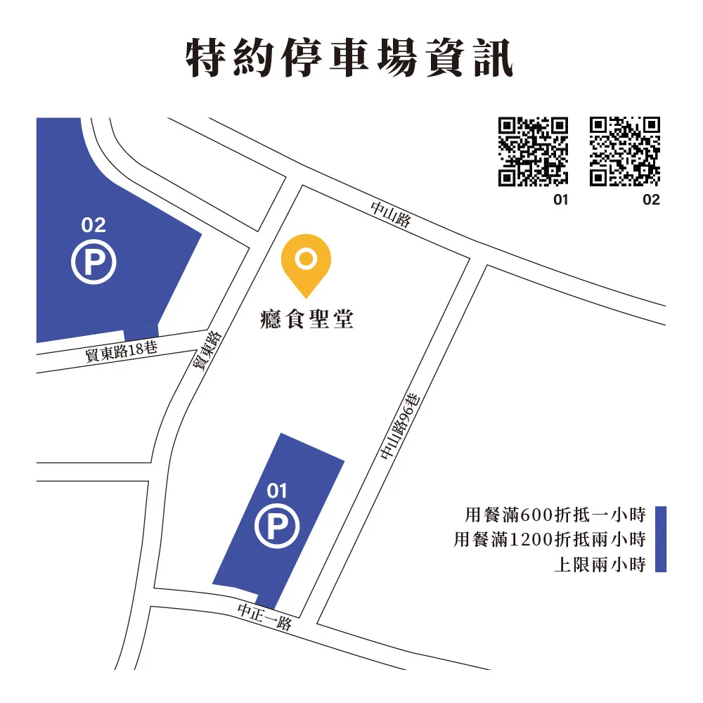 癮食聖堂有兩處專屬的特約停車場,分別是創新停車場(桃園市平鎮區龍平路21號)與中正一路停車場(桃園市平鎮區中正一路2-24號)。只要用餐滿600元,可折抵1小時,滿1200元,可折抵2小時,折抵上限為2小時。