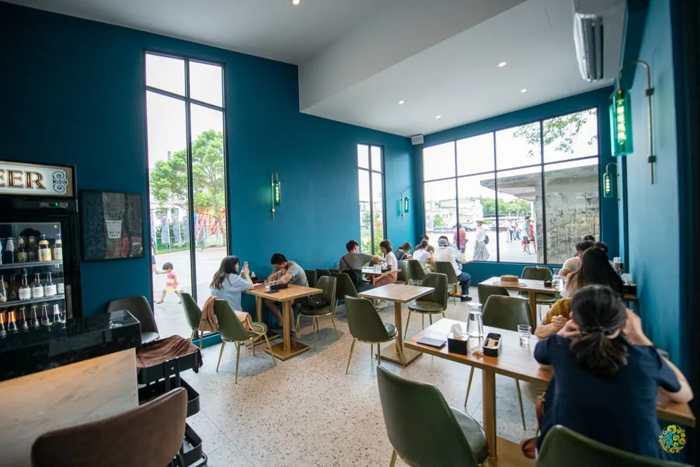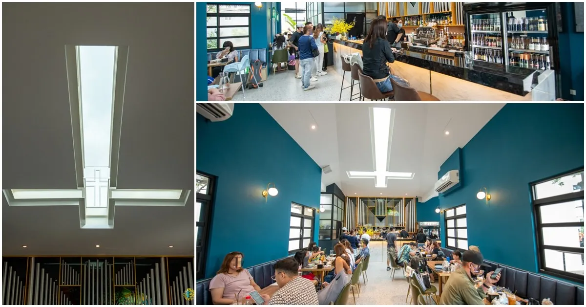 癮食聖堂 POPPY CHURCH最吸引人的地方莫過於她保留住教堂的特色外觀,天花板上鏤空的大型十字架更是吸睛的焦點,也是來訪遊客必拍的景點之一。門口上方的十字架與彩色玻璃窗是另一處熱門拍照打卡點,而吧檯後方的風琴裝飾呼應了教堂特色主題,以俐落鮮明的現代設計風格,將莊嚴肅穆的教堂場所堆砌出微奢的時尚感,打造出清爽動人的藍白空間。