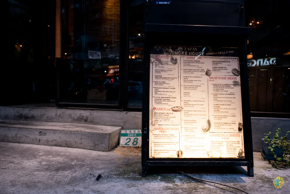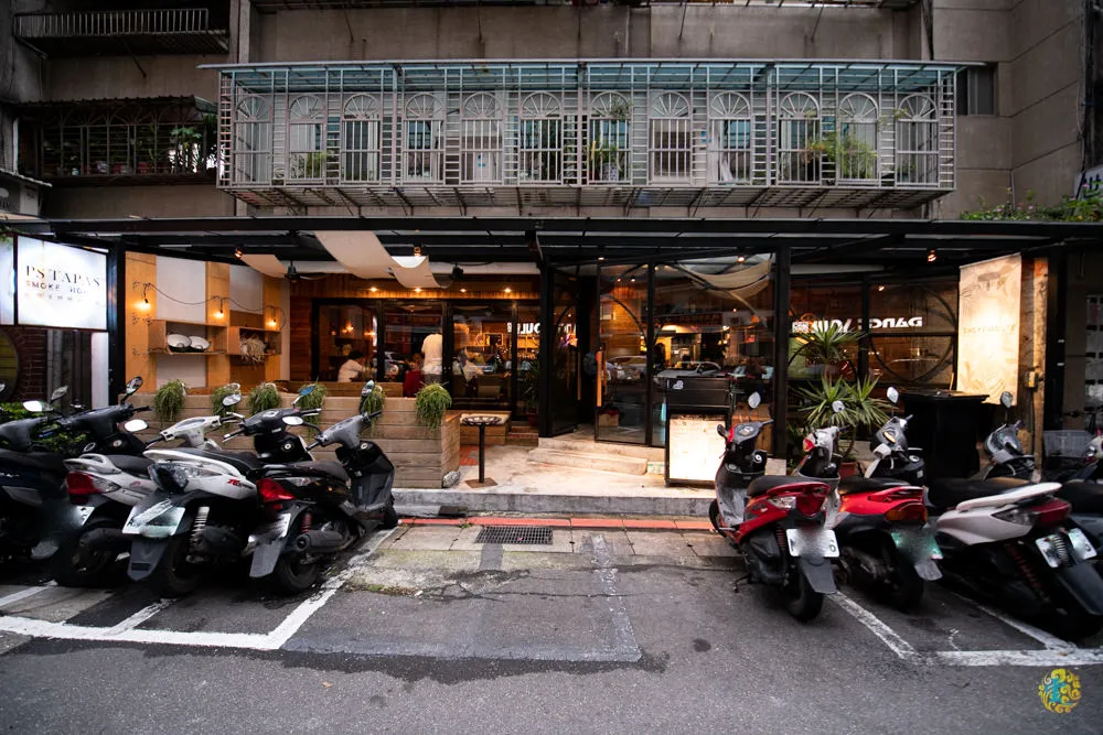 PS TAPAS 煙燻小酒館就在國父紀念館附近的巷弄裡,從捷運國父紀念館站2號出口走過來約莫5分鐘路程。門口的戶外用餐區相當吸引人,來杯西班牙雪莉調酒,在涼爽的夜晚與志同道合的好友在這一起把酒言歡,那種彷若置身西班牙街頭的愜意,絕不是三言兩語可以形容的。