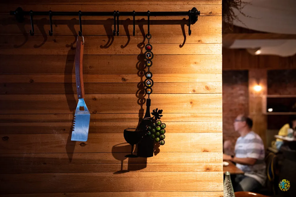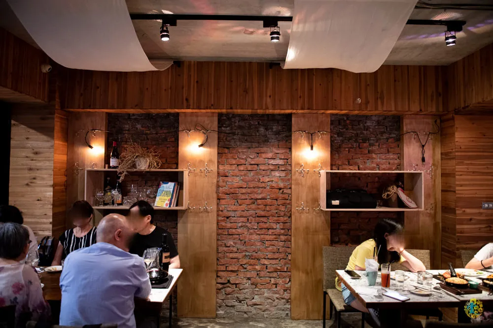 PS TAPAS採用典型的西班牙鄉村風設計,透過大面積的落地窗迎來明亮的光線,且營造出視覺上的延伸與穿透感;大量使用原木與紅磚等天然素材呈現淡雅質樸的田園氣息,搭配黃色燈光給予溫暖沉穩的感受。廚房裡有著醒目紅色的烤箱是來自於西班牙炭火烤箱品牌的Mibrasa煙燻烤箱,他能將食物的原味鎖住,並透過煙燻的方式給予食材不一樣的風味。
