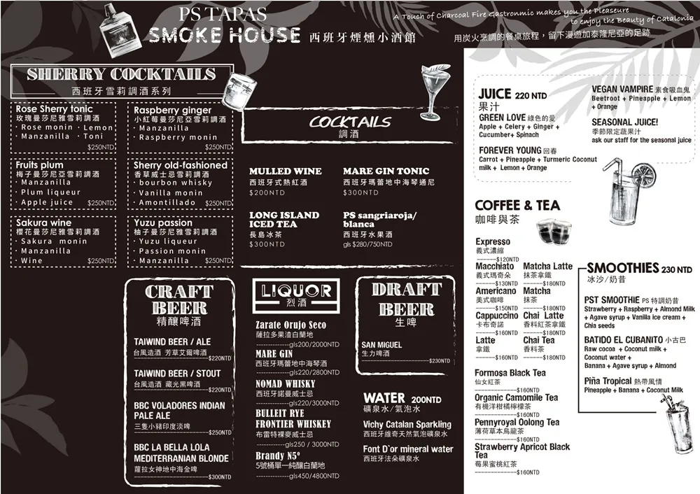 PS TAPAS煙燻小酒館是西班牙雪莉酒的代理商,在這裡可以喝到各種不同風味的雪利調酒,當然想要烈一點的威士忌或是獨特風味的精釀啤酒,這裡也有提供。