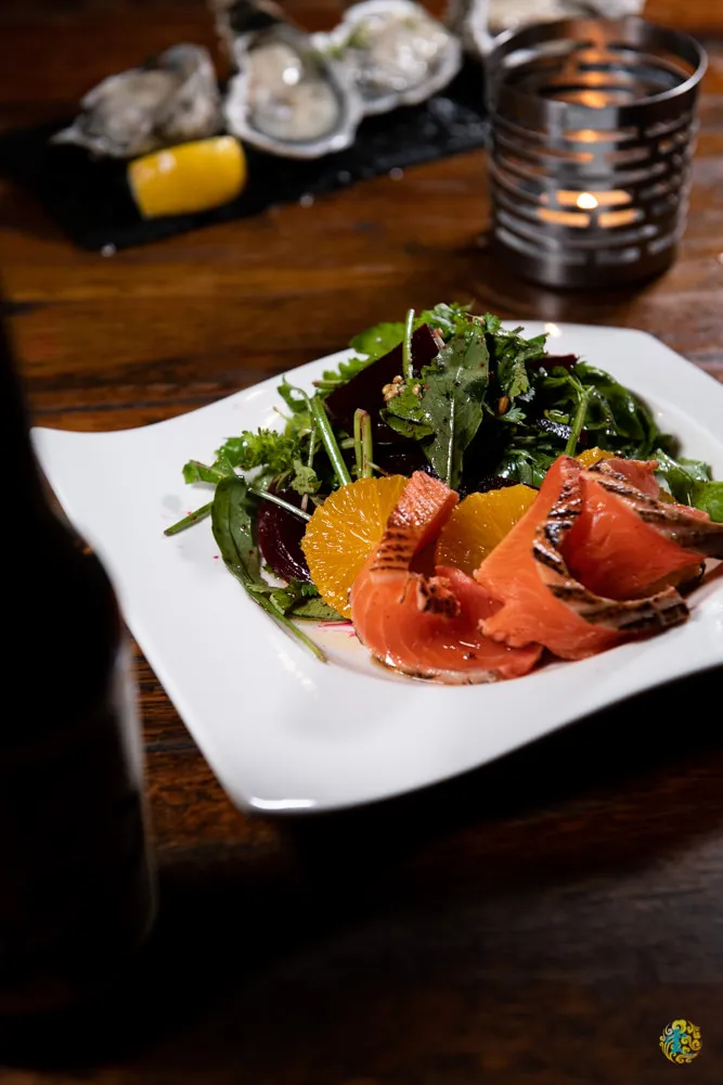 將國王鮭用甜菜根泥醃過一個晚上,再搭配蔬菜、芝麻葉、甜菜根以及柳橙切片。這道菜很特別的地方是,他先將鮭魚炙燒過後才切,所以炙燒面會在側邊,跟一般印象中切完再炙燒很不一樣。肉質細嫩又富含油脂的國王鮭,入口滑潤的鮮甜滋味,在炙燒過後綿密的入口即化,搭著蔬果與甜菜根一起食用,讓國王鮭的豐富油脂清爽一下,讓整體滋味更顯香甜可口。