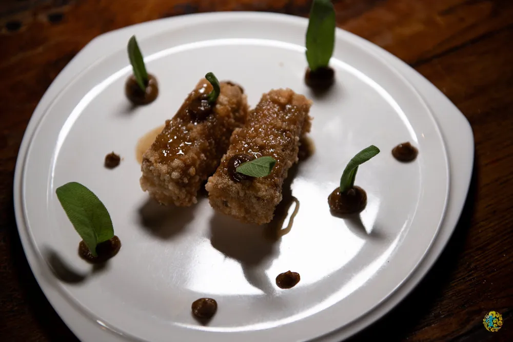 將豬蹄、肉跟蝦子包在一起油炸,上方與周圍使用烤過的地瓜打成的醬泥點綴,豐富的內餡與酥脆的外皮譜寫美妙的味覺樂曲。