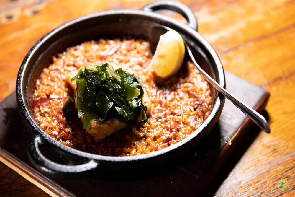 在炸過的比目魚上撒點海菜,在番茄烤飯中參雜不少片狀火腿,造就了色彩繽紛的烤飯。油脂非常豐富的比目魚,酥炸過後香氣逼人,入口即化的美妙滋味,讓人印象深刻,建議淋上檸檬汁提味,平衡一下過多的油脂。鹹甜交錯又帶著一點點酸的蕃茄火腿烤飯,味道的厚度令人激賞,最底下的鍋巴香脆可口。
