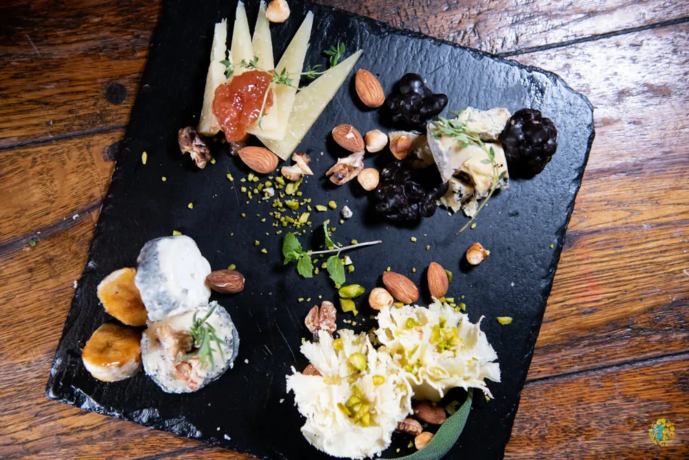 這份是隱藏式餐點,整盤滿滿的羊奶味,喜歡的可以直接跟店家order。左下是羊奶起士與香蕉,羊奶起士算是裡使相當古老的起士,質地偏半硬質,口感也比較厚實,PS TAPAS巧妙地提供香蕉切片搭著奶香十分誘人;右下是僧侶頭起司,彷若蕾絲花般的僧侶頭起士又稱為修道士乳酪,滑順如絲的口感,甘甜濃醇;右上是藍黴起士、堅果跟巧克力,鹹味偏重且氣味刺激的藍黴起士,PS TAPAS利用堅果與巧克力去創造鹹甜交錯又有咬勁的美食深度;左上是蒙切戈起司加榲桲果醬,有著核果與焦糖的香氣的蒙切戈起司,帶點鹹味的後韻搭著花果香醇濃厚的榅桲果醬,味道濃郁得令人陶醉。