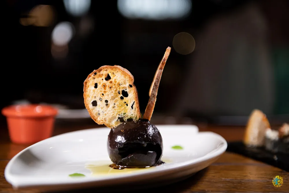 將白豆加入肉腸燒烤,是加泰隆尼亞地區的傳統菜餚,PS TAPAS在其上添加茄子、炭甜椒與洋蔥,最後補上自製的炭味美乃滋。有點重鹹的肉腸,適度的調味讓其香氣逼人,將一整顆肉腸送入口中,咀嚼時肉汁滿溢口腔,堅實彈Q的肉質參雜著豆泥的口感,炭味美乃滋的焦香適時的去油解膩,巧妙的綻放混種的美味風采。