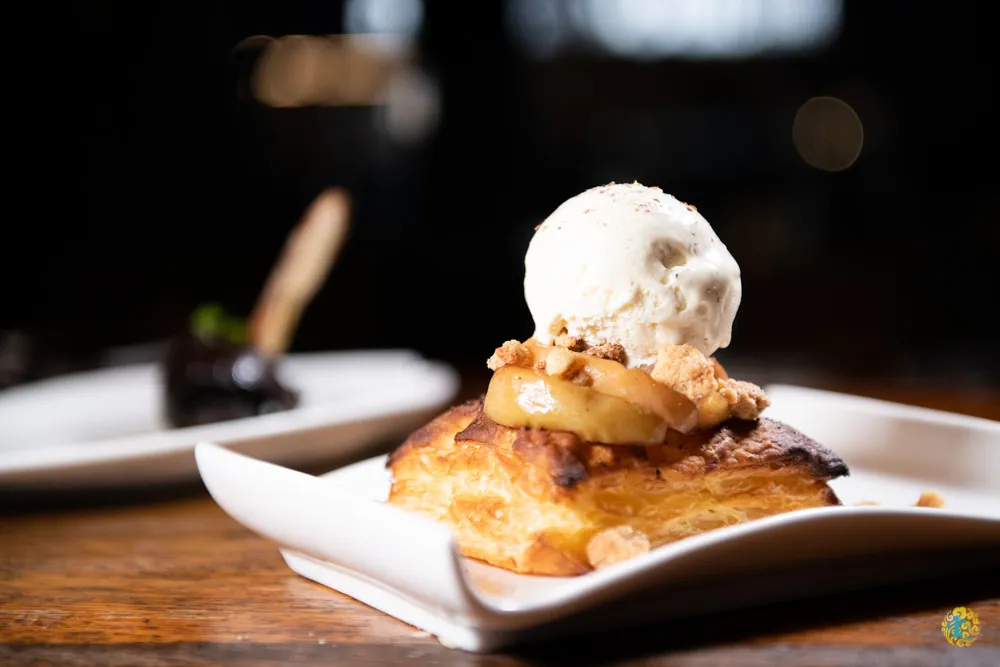 煙燻過後的蘋果酥皮香氣肆溢,濃稠滑順的香草冰淇淋更添甜美風華,酥脆的餅皮配上酸甜的蘋果切片,入口後的層次超有意思的。