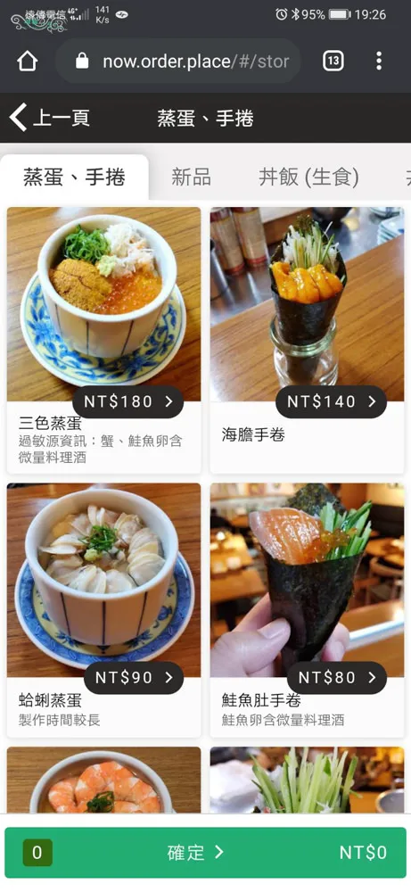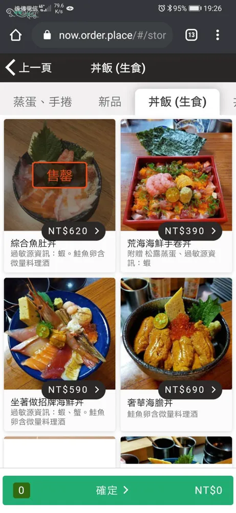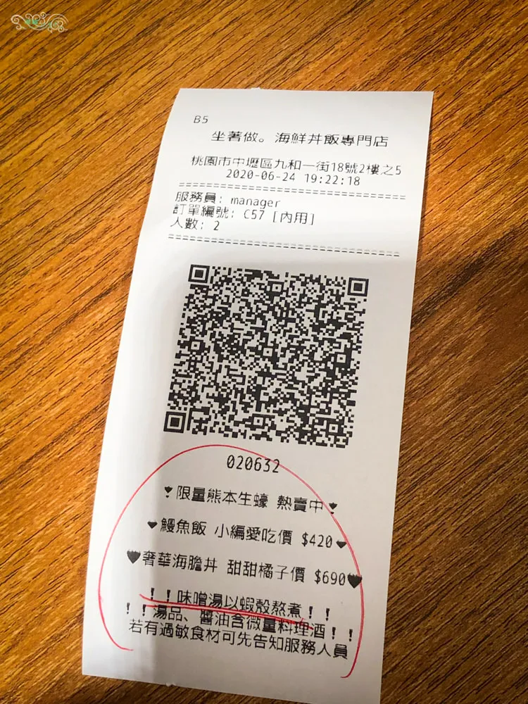 選好位置入座後,服務人員會送上一張帶有桌號與QR Code的小紙條,直接拿起手機掃描上面的QR Code,就可以看到坐著做。海鮮丼飯專門店的菜單,如果真的沒帶手機的話,櫃台也是有紙本菜單可以點餐。凌雲稍微說明一下點餐流程,首先用手機掃描QR Code即會出現坐著做。海鮮丼飯專門店的首頁,點擊螢幕後就會出現分格式的圖文菜單選項,分別有蒸蛋、手卷、新品、丼飯(生食)、丼飯(熟食)、食材加點與飲料等分類頁籤,品相與價錢都清楚標示,想吃哪一個直接點選照片,在選擇數量,飯的份量也可以在點餐時作調整,餐點都選完之後,點選下方的【確認送出訂單】,服務人員就會遞上點餐清單,上方會有用餐人數、點餐時間、桌號與餐點列表,真的超方便的說。