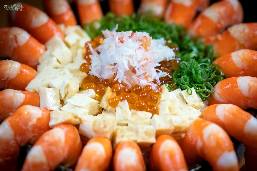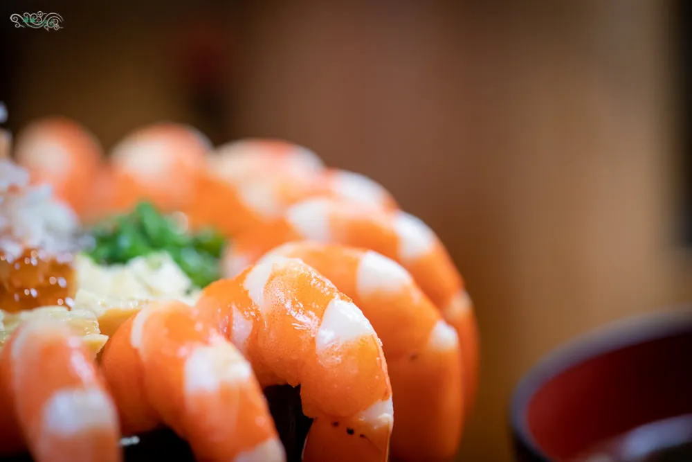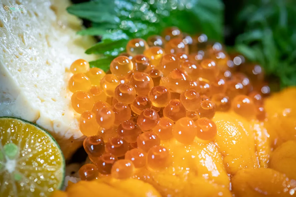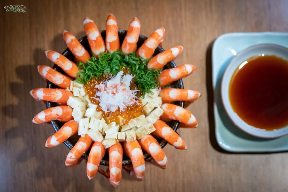 在入口時會直接化掉的鮮甜鮭魚卵,濃厚的魚子香氣與溫醋飯相得益彰,其美味真是難以言喻。在搭上肉質飽滿細緻的松葉蟹,勾勒出清甜鮮香又富含彈性的味覺新樂園。清甜又新鮮的白蝦,肉質爽脆彈牙,沾上一旁坐著做特別調配過的柚子醬油後,讓白蝦更加甘甜鮮美。