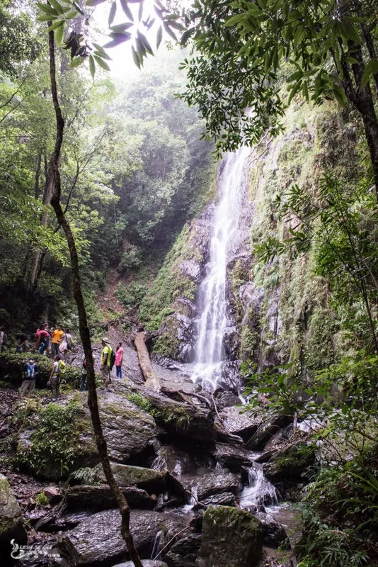一群遊客在瀑布下爭相與瀑布合影