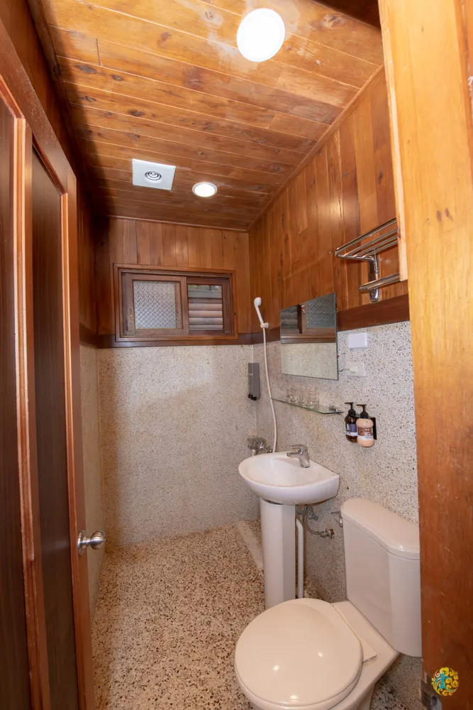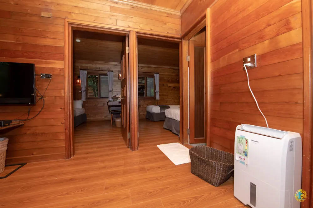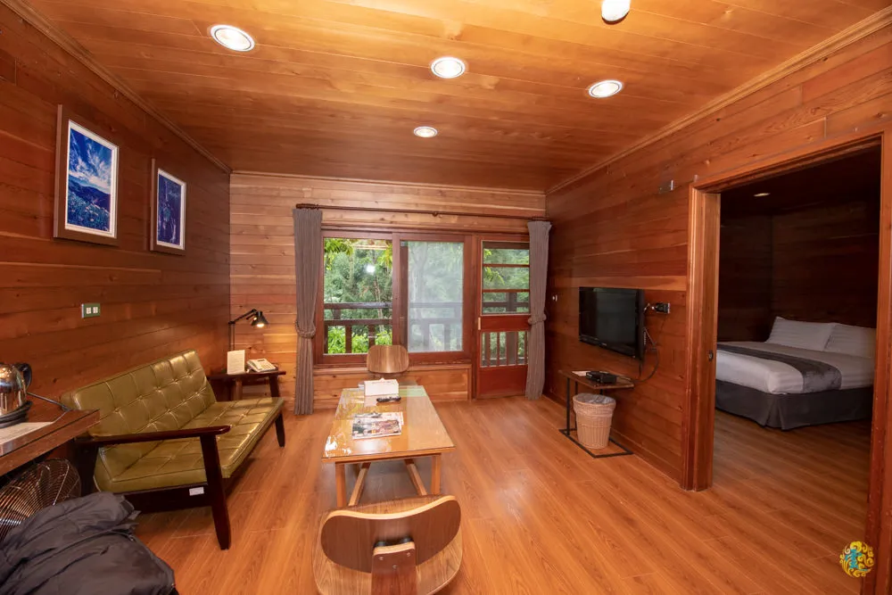 小木屋的前方有個小陽台,保有明亮的採光與美麗的風景,內部是一廳兩房一衛的設計,以楠木為空間主要建材,一進門就感受到那淡淡的原木香氣,透過單純的線條設計,流露出自然無壓力的氣息,營造自在慢活的居住氛圍。寬敞的客廳配有電視、小冰箱、空氣清淨機與茶具組,依舊保有適當的機能性。桌上還貼心的擺有中台灣相關的旅遊雜誌。電視不但配有第四台,而且台數相當完整,友人覺得這點非常好。