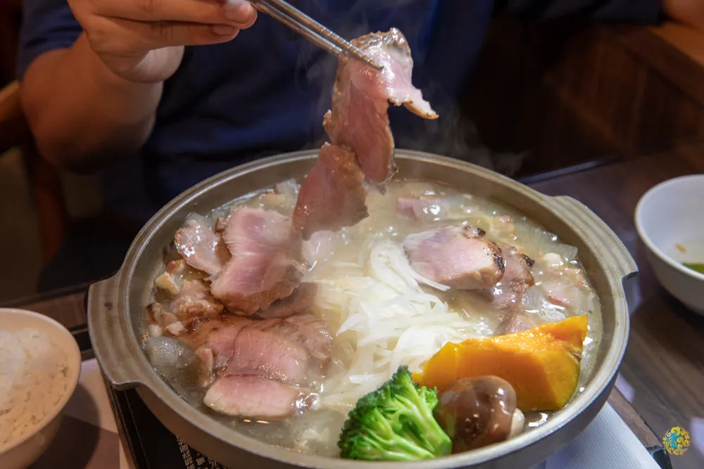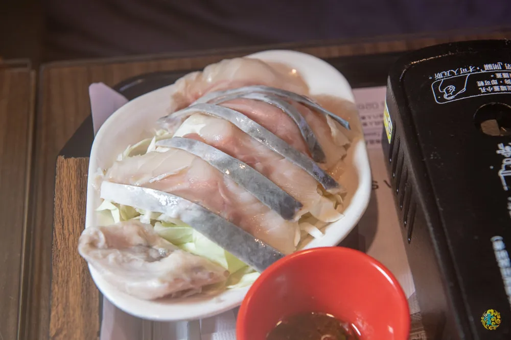 主菜有鱘龍魚片與鱘龍魚骨,魚骨先放入湯中熬煮,讓昆布湯頭多了鱘龍魚骨的甘醇鮮味,鱘龍魚片清涮幾下,變色後即可食用,一入口,鱘龍魚片的鮮味在嘴裡橫衝直撞,肉質鮮美Q彈偶而還會咬到脆脆的魚軟骨,很立體的口感。