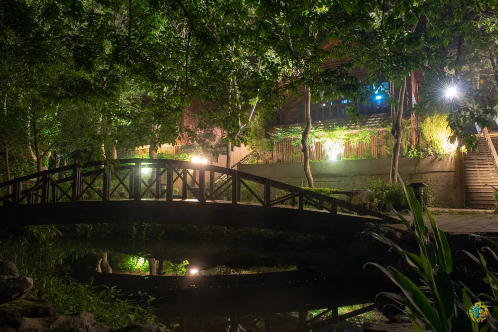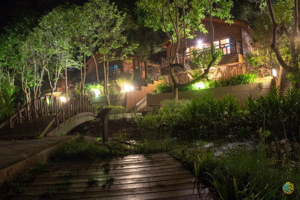 夜晚的八仙山莊別有一番風味,從生態池望向漫森餐廳與渡假小木屋,那耀眼的燈光讓小木屋更顯魅力。