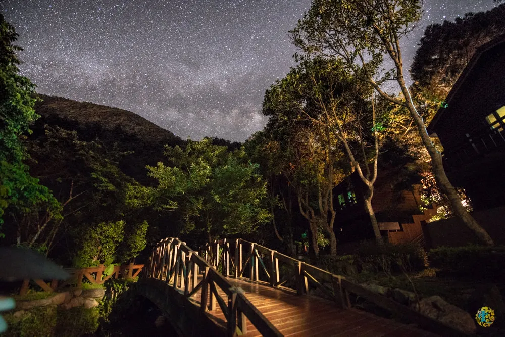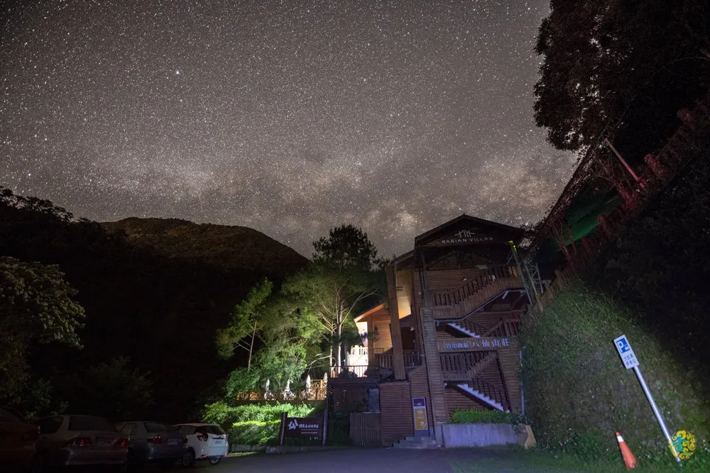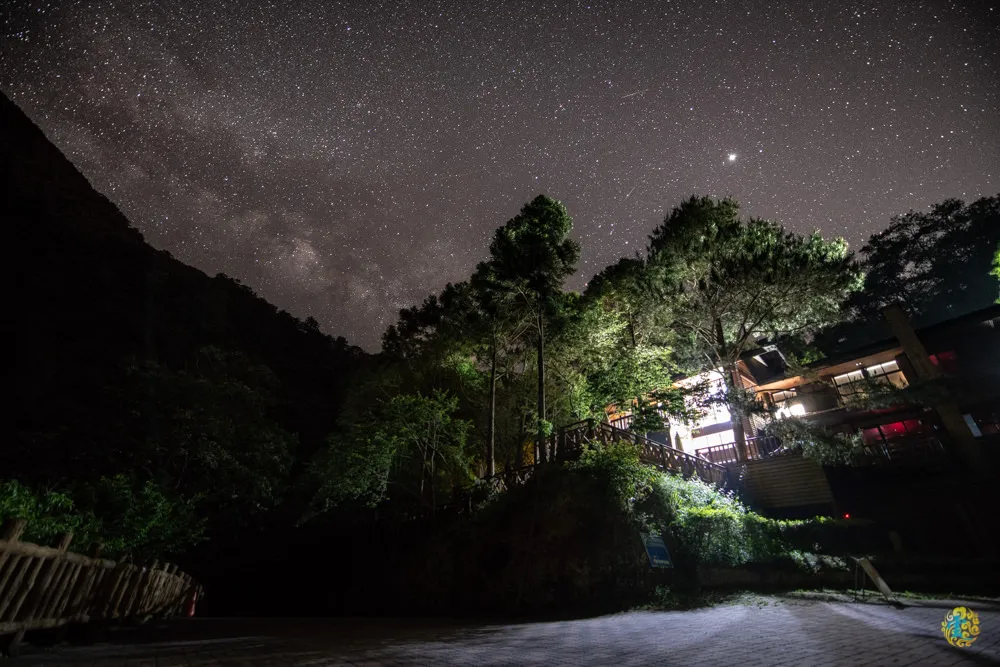 山莊人員表示,晚上八點之後漫森餐廳就沒有工作人員了,如果有任何問題一樣可以撥打房內註明的電話,還是會有山莊留守人員可以提供服務,而晚上十一點過後山莊所有的燈光都會關掉。凌雲算了一下今夜銀河升起地平線的時間,約莫十一點多,跟三五好友在小木屋內聊天看電視,享受貼近大自然的悠閒,不知不覺時間來到凌晨一點說。跟好友一起走出小木屋,享受夜晚的涼爽寧靜,抬頭仰望滿天星斗,由於毫無光害,星空清澈又清晰,真是個觀星的好地方。因為群山繚繞的關係,發現銀河的位置還有點低,散散步之後便回房休息,鬧鐘訂兩點多想出來再拍一次位置較佳的銀河,誰知醒來已清晨七點XD