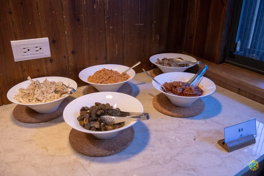 在八仙山莊,蟲鳴鳥叫是大自然賦予的鬧鐘,早晨清新的空氣讓人神清氣爽,簡單梳洗之後,便驅步漫森餐廳享用美味早餐了。漫森的早餐採自助式供應,飲品有熱紅茶、熱豆漿、黑咖啡與葡萄汁,也有簡單的生菜沙拉與水果,各式小菜、炒米粉與麵包,一旁還有養身小米粥與醬菜。凌雲被安排的位置就在窗邊,一邊享用早餐,一邊欣賞生態池的山林美景,美好的一天就從漫森美味早餐開始。