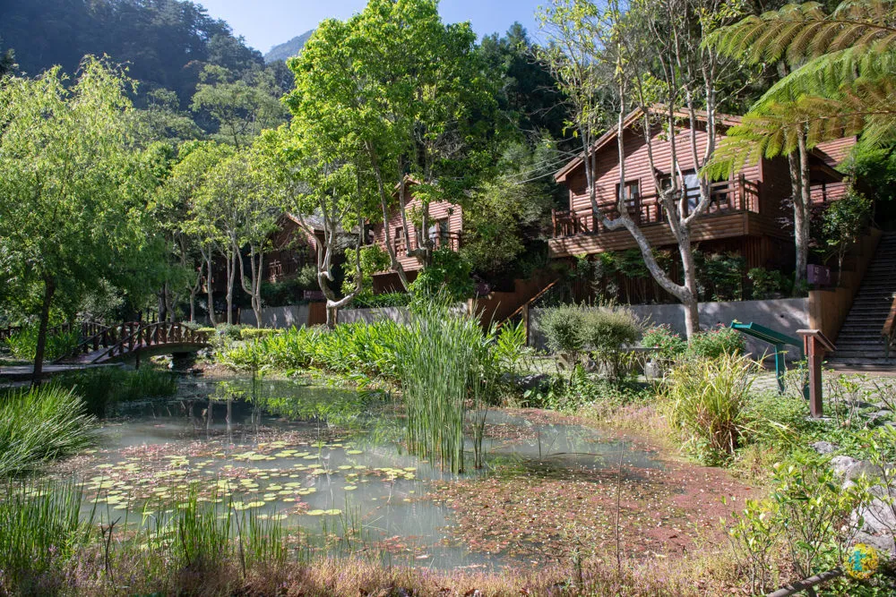 左側是生態池,右側則是A區四人度假小木屋。