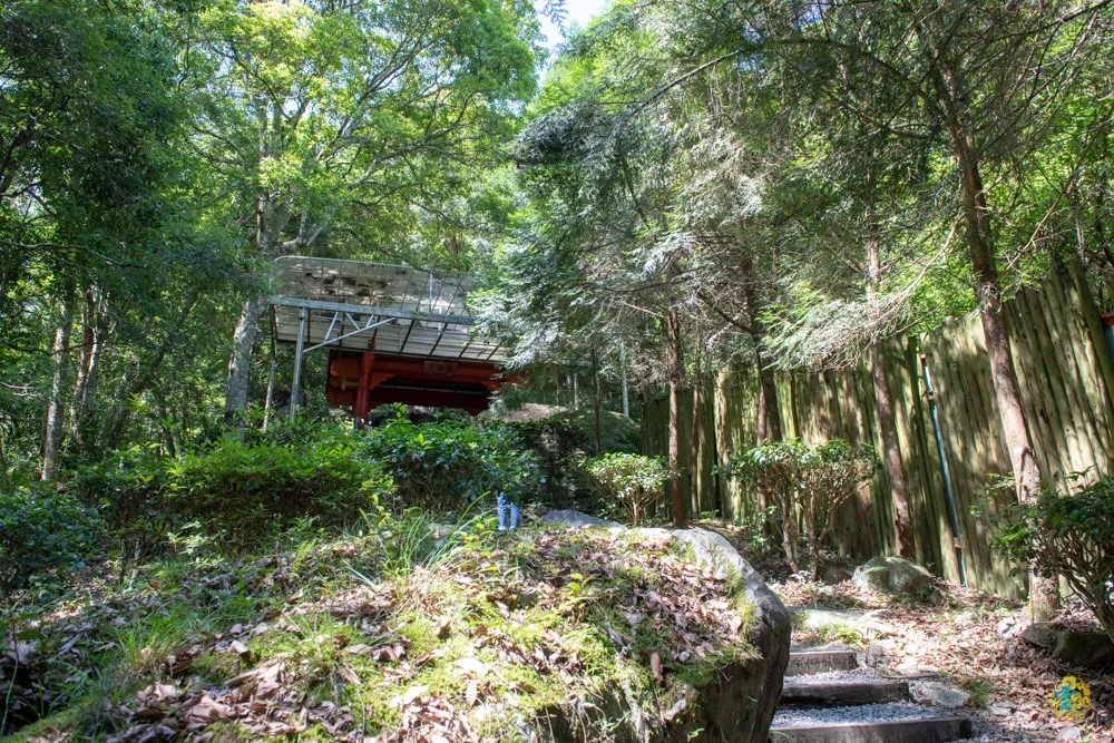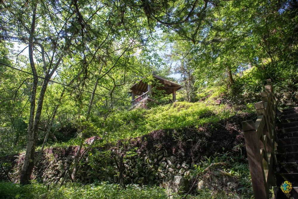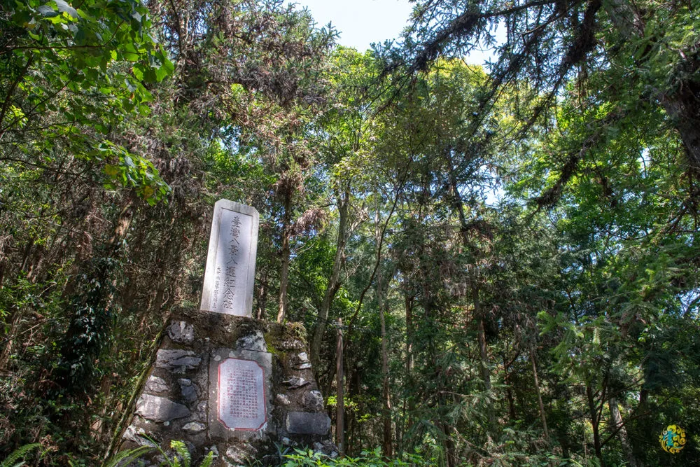 中途經過神社遺址,日治時期日本人在此建立一座小神社,後來因為戰火僅存基台,921地震過後就只剩地上兩個鳥居穴了,最後從原址重建尋悠亭以供乘涼與懷念。