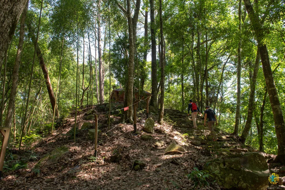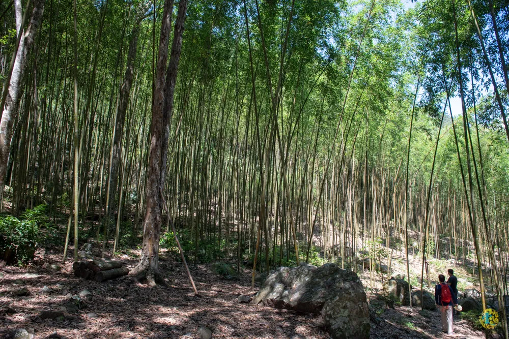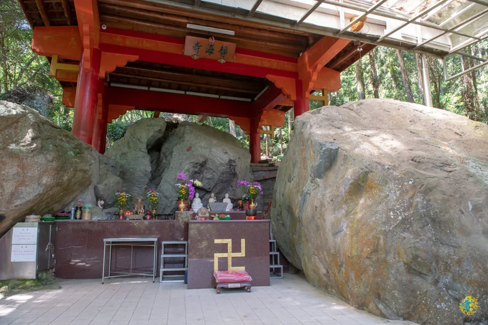 靜海寺被一些粗曠巨石所包圍,裡面擺放幾尊神像,這裡算是半日輕鬆遊/一日健康遊的頂點了,後方即是八仙山的登山口。八仙山號稱谷關七雄之首,標高2366公尺,據說來回約需八個小時,八仙山登頂不在此行計畫之內,所以凌雲一行人繼續往右方竹林前進。