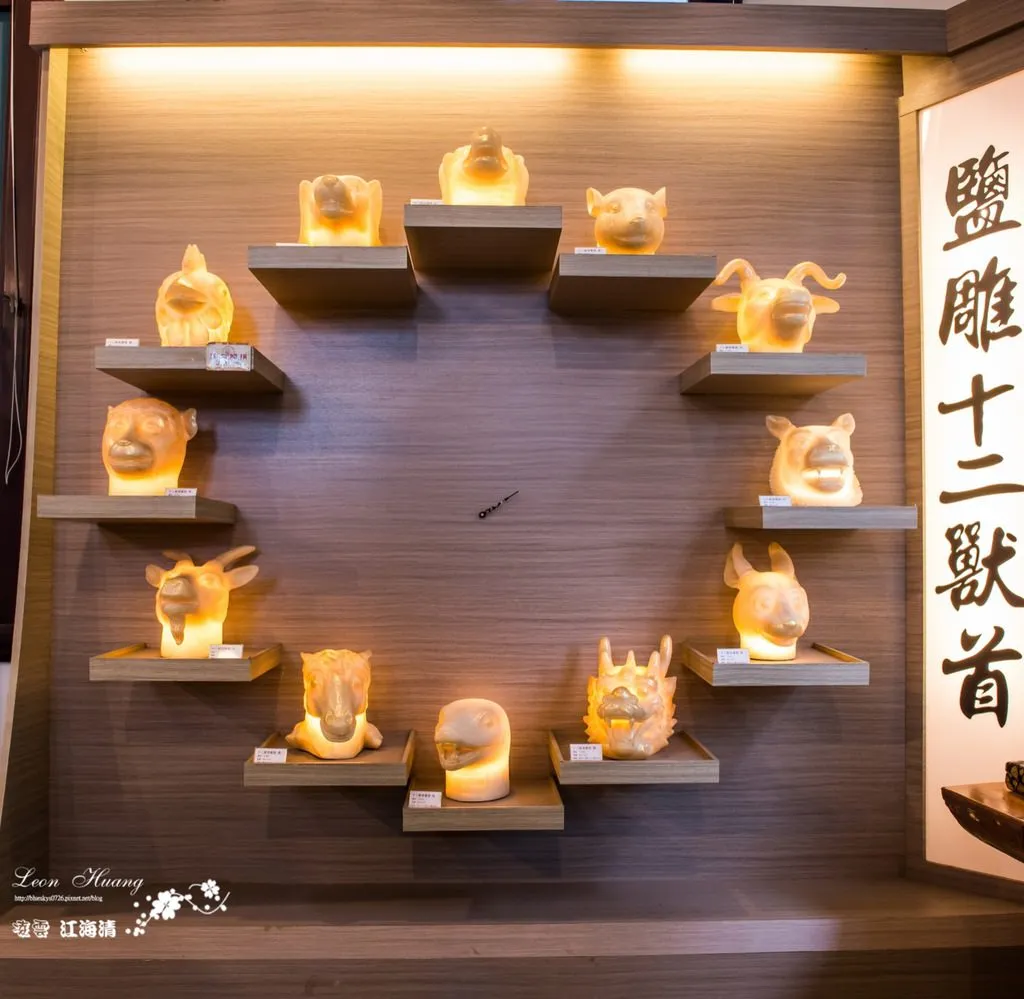 這個鹽雕十二獸首,則是以十二生肖為主題,中間搭著時分針,就像個大型時鐘,不過時分針並不會動XD