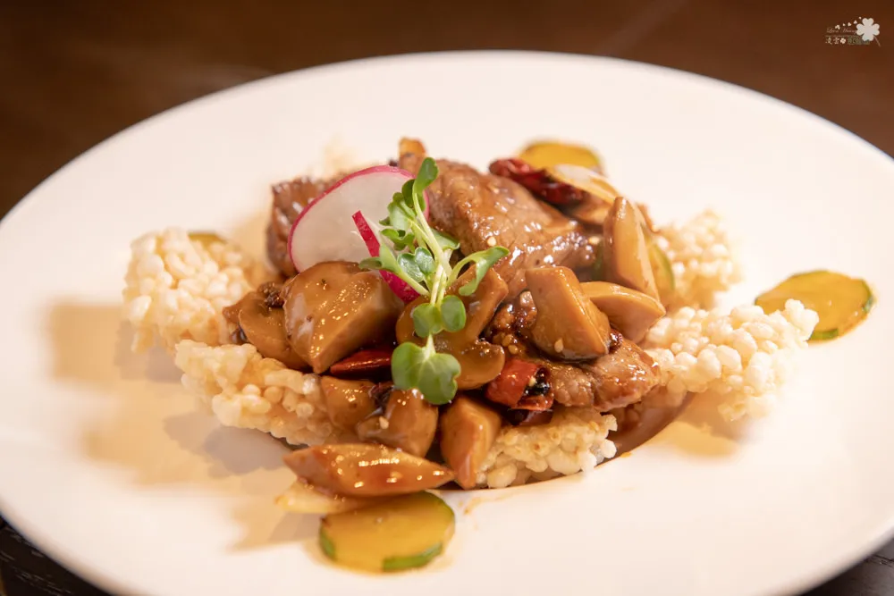 入味而不奪味的中式宮保醬汁,讓頂級菲力牛肉的滋味更豐富飽滿,牛肉肉質鮮嫩柔美,跟著鍋巴一起入口,鍋巴酥脆的咬勁讓口感超立體,微辣的辣椒在嘴裡橫衝直撞,滋味如浪潮般一波一波,饒富趣味的美食深度。